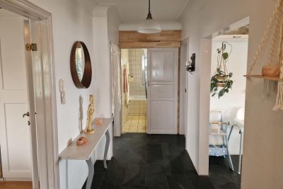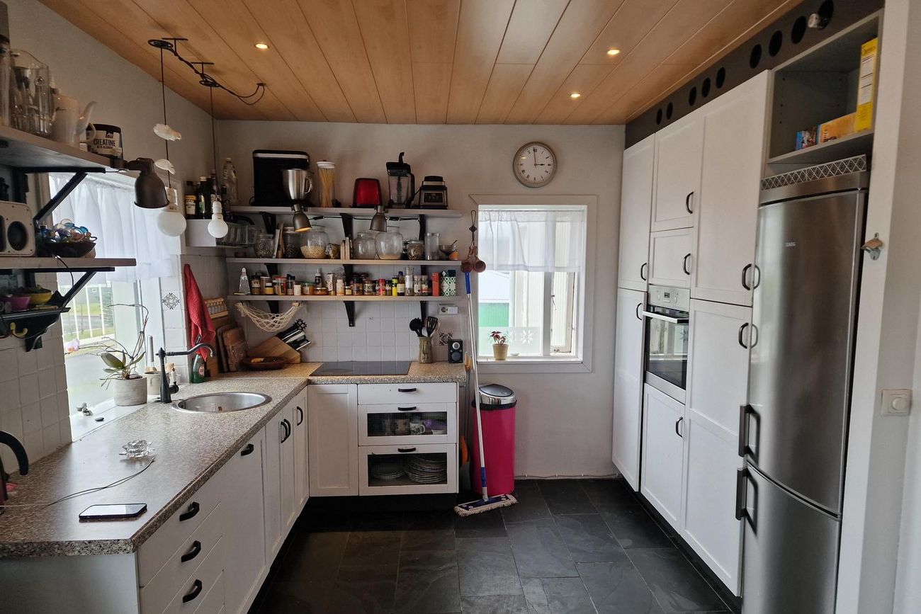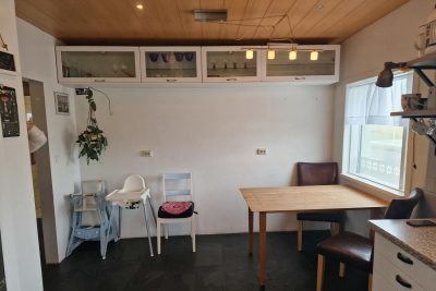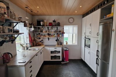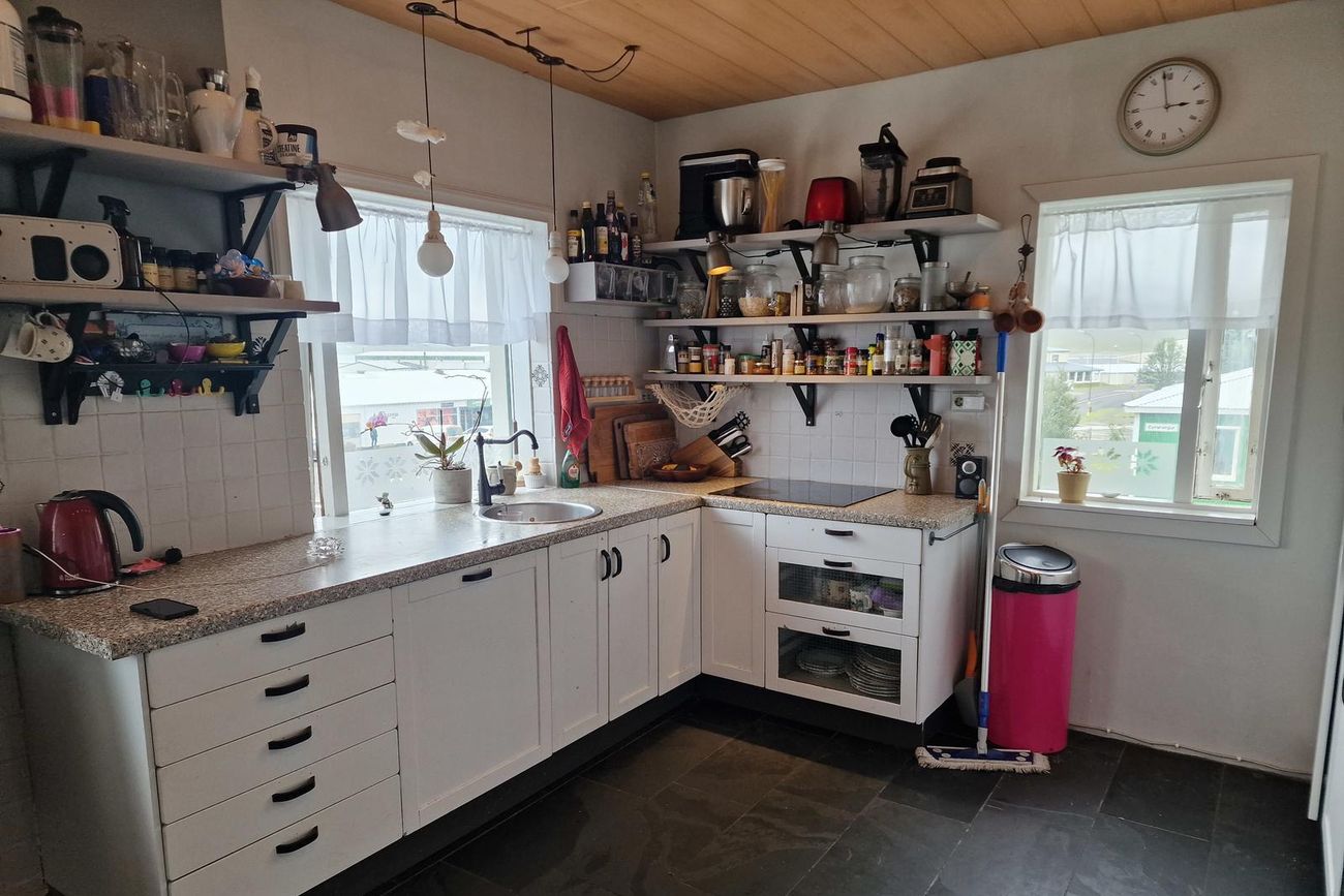 Eldhús: Steinflísar á gólfi. Hvít lökkuð Ikea innrétting. Stór skápaveggur með plássi fyrir stóran ísskáp, bakarofn á vegg, lokaður skápur fyrir örbylgjuofn og útdraganlegum hillur. Neðri skápar eru skúffur, og opnar hillur. Uppþvottavél innbyggð í innréttingu. Góður borðkrókur.