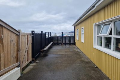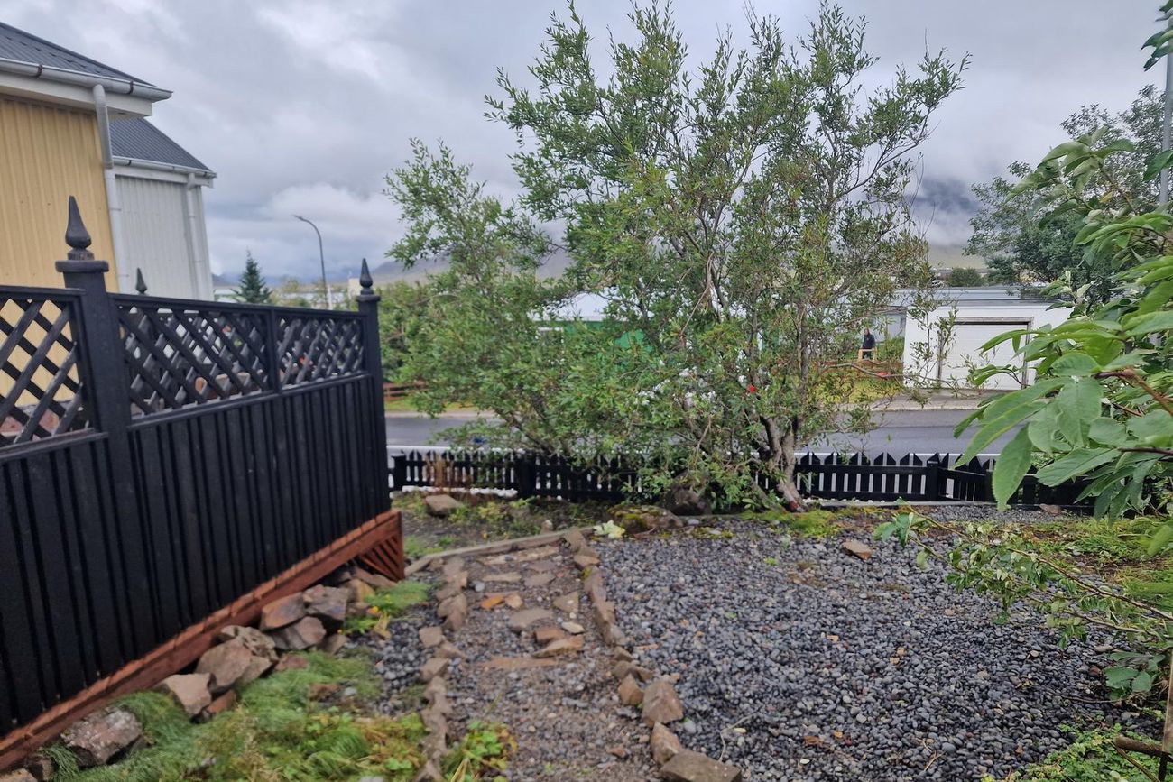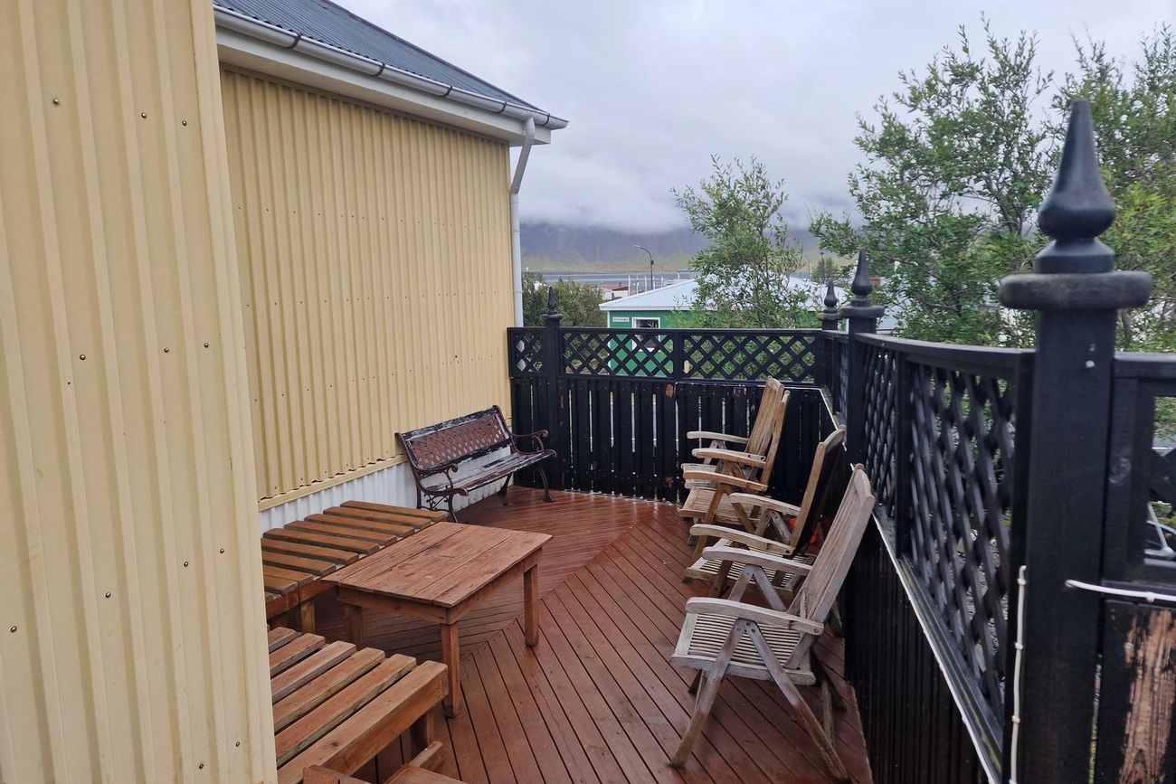 Sólpallur: Gengt úr stofu, timburpallur með skjólveggjum og steyptur pallur með vesturhlið húsins. Útsýni yfir fjörðinn og kirkjufell.