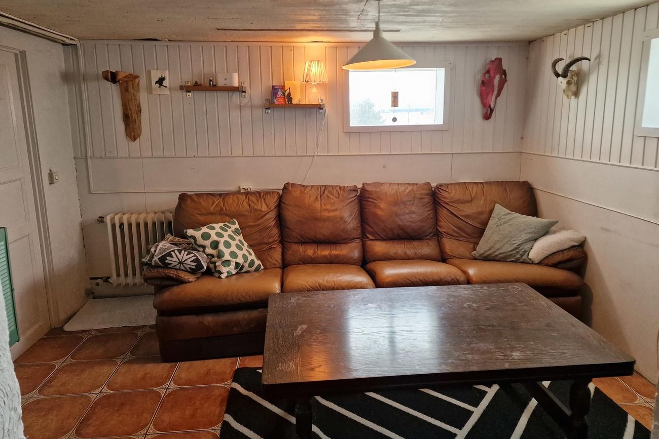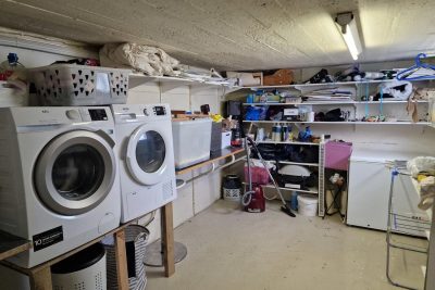 Þvottahús: Steingólf lakkað, upphengdar hillur og mikið geymslupláss.