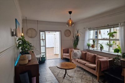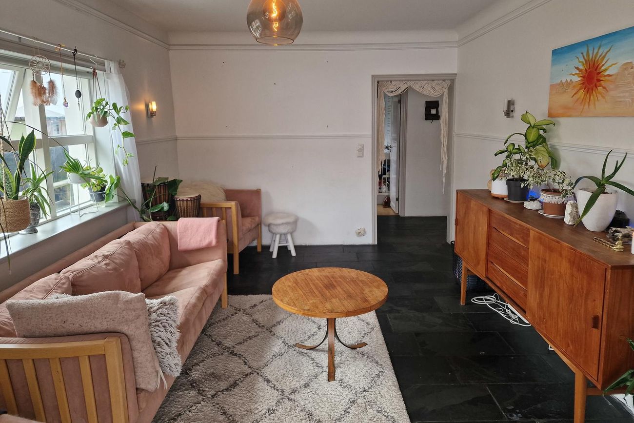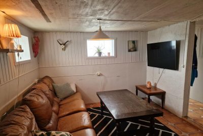 Stofa: Steinflísar á gólfi og svalahurð út á sólpall.