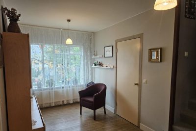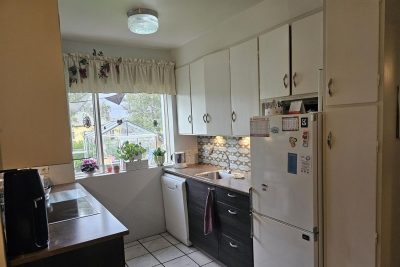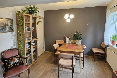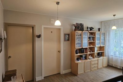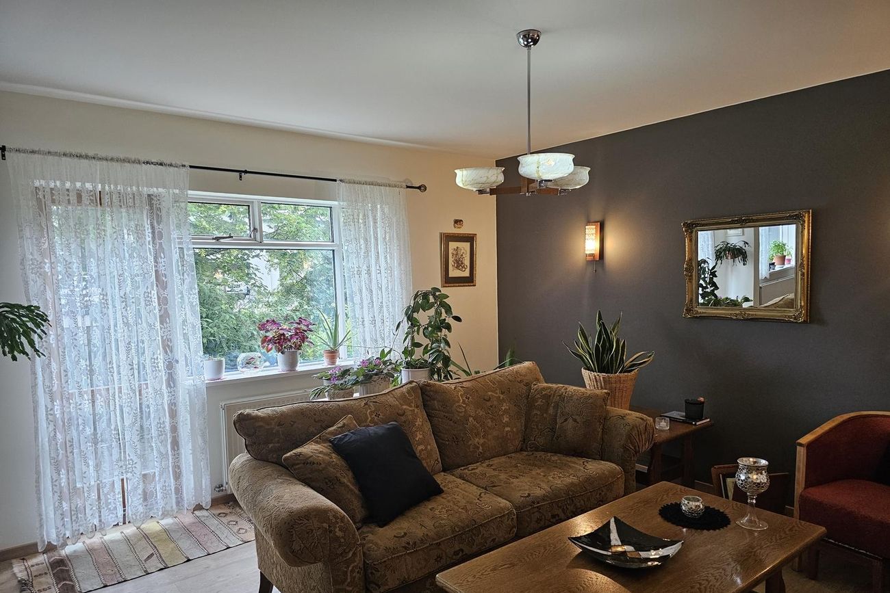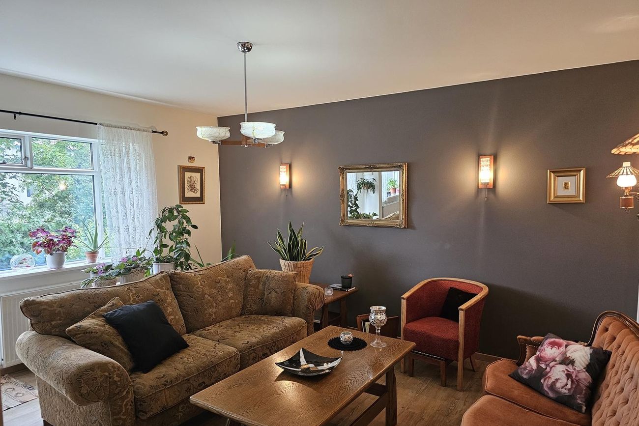 Stofa og borðstofa vinilparket. Gengt er um svalahurð úr stofu út í garð. Auðvelt að loka vegg á milli og bæta þannig við svefnherbergi.