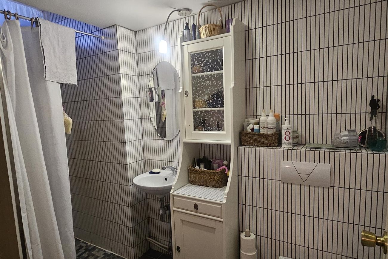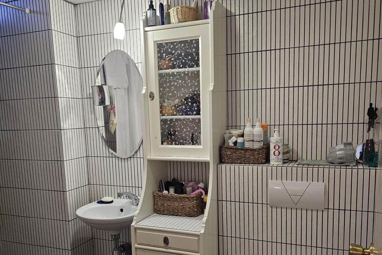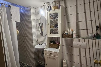 Baðherbergi á neðri hæð flísalagt í hólf og gólf. Innrétting, vegghengt salerni og sturta.