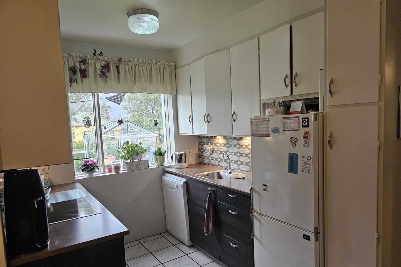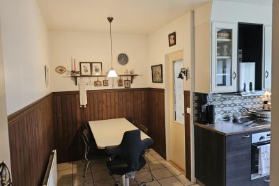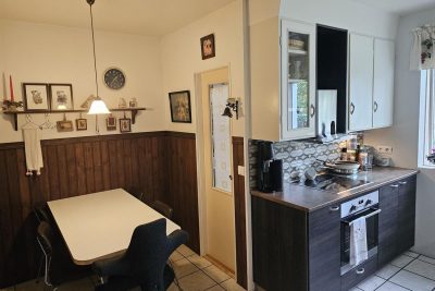 Eldhús með góðri innréttingu og borðkrók. Flísar á gólfi. Inn af eldhúsi er búr með glugga, flísalagt gólf og góðu hilluplássi.