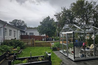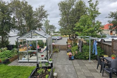 Lóðin er vel hirt og gróin með hellulögnum, gróðurhúsi, trjágróðri, skrautjurtum og grasflöt.