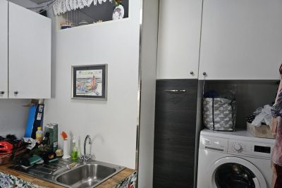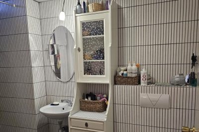 Snyrting vaskur í skáp og dúkur á gólfi.