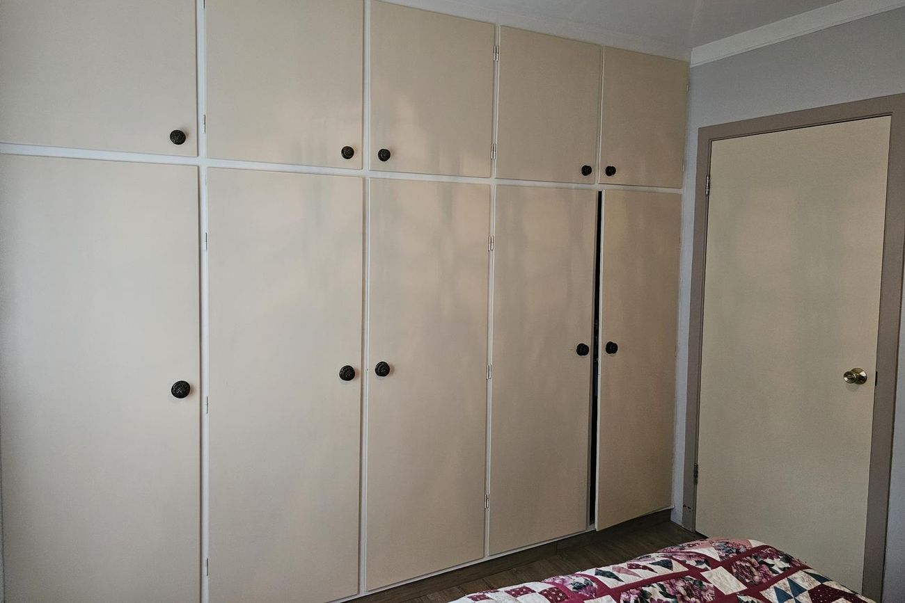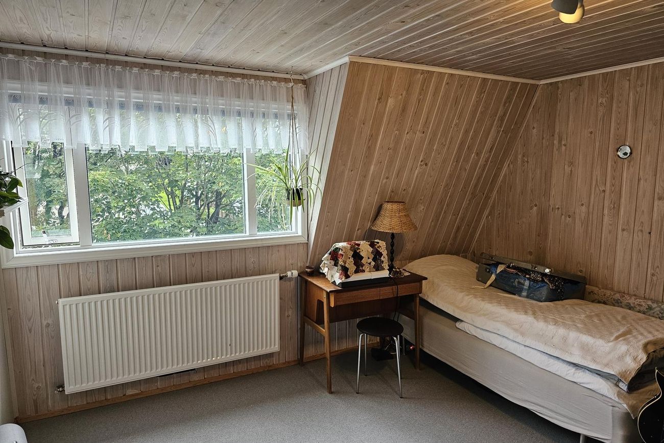 Svefnherbergi á hæðinni með parket á gólfum og rúmgóðum skápum.