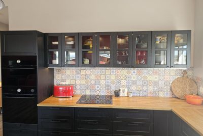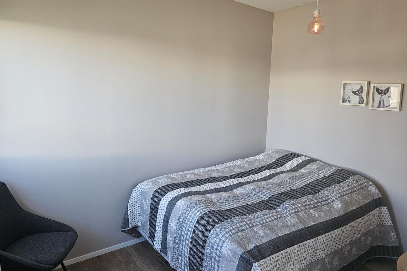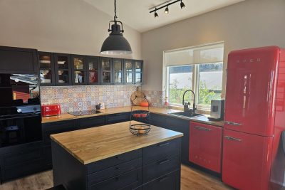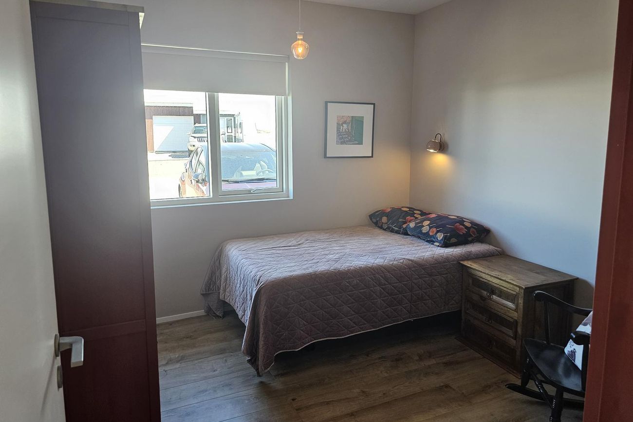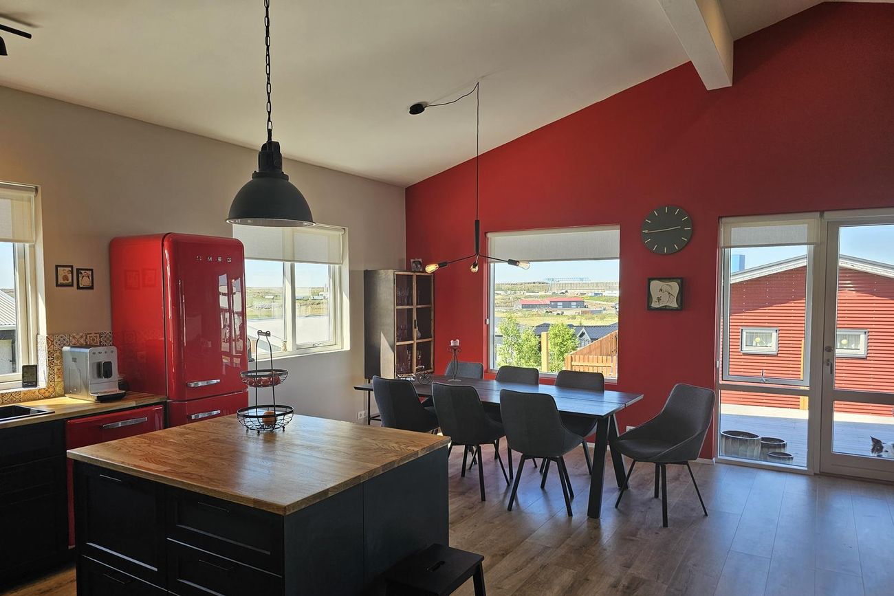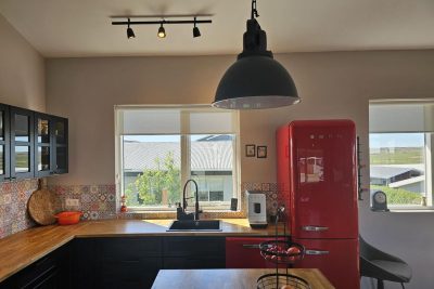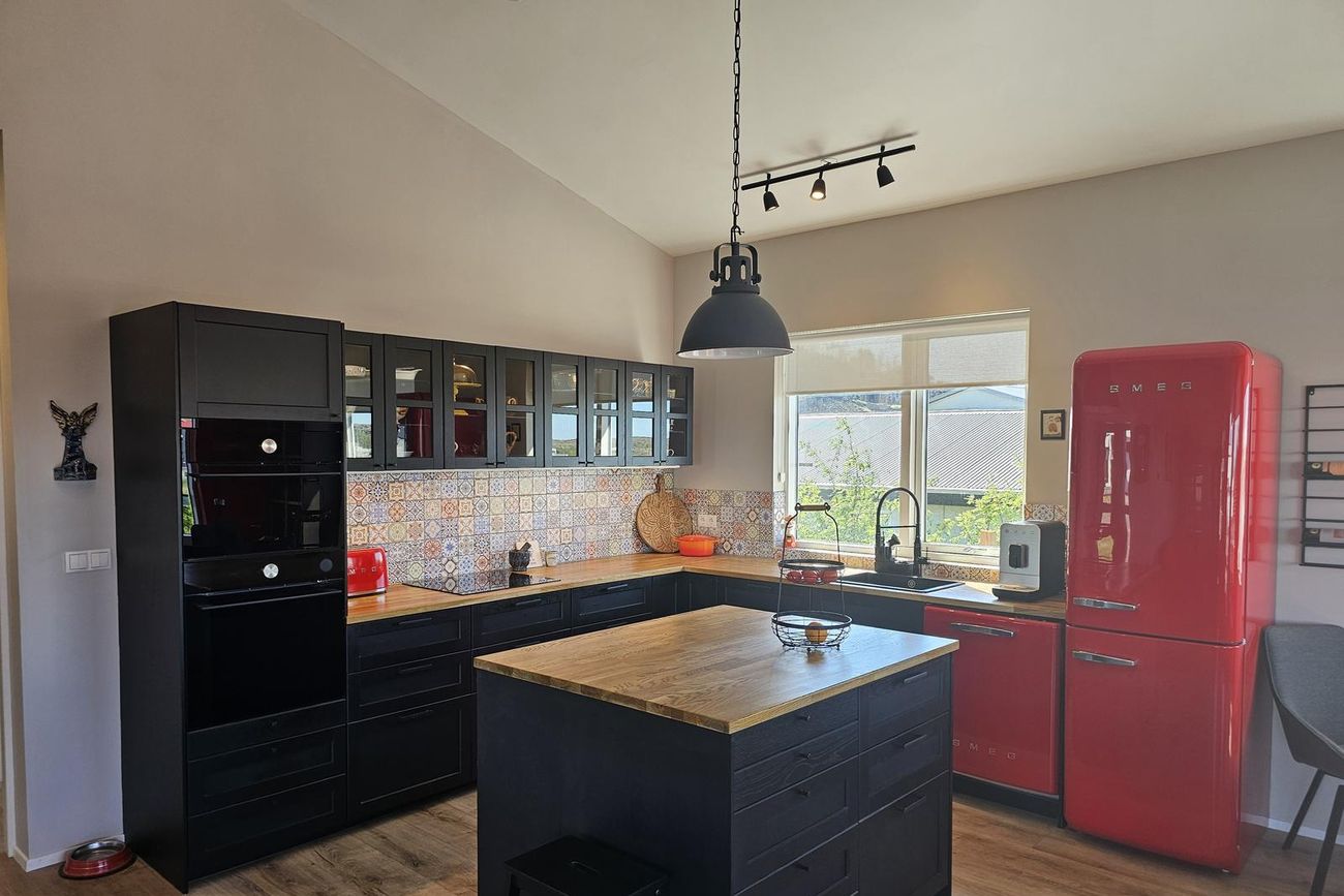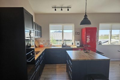 Eldhús: Rúmgóð dökk innrétting með eyju. Helluborð og háfur, Bakarofn og örbylguofn í innréttingu og innbyggð uppþvottavél. Ísskápur getur fylgt eftir samkomulagi.