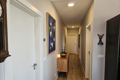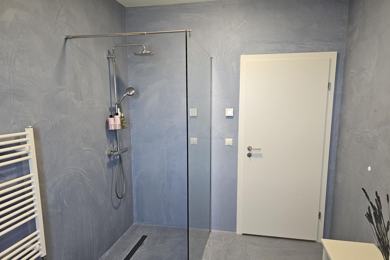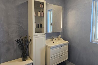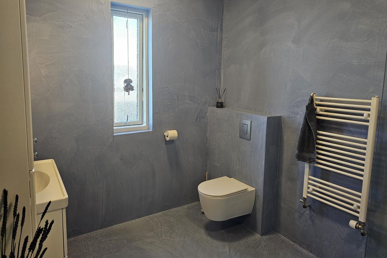 Baðherbergi: Rúmgott. Microsement á veggjum og gólfi, vegghengt salerni og walk-in sturta. Góð hvít innrétting með haldklæðaofni á vegg.