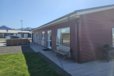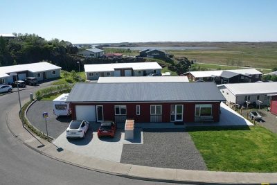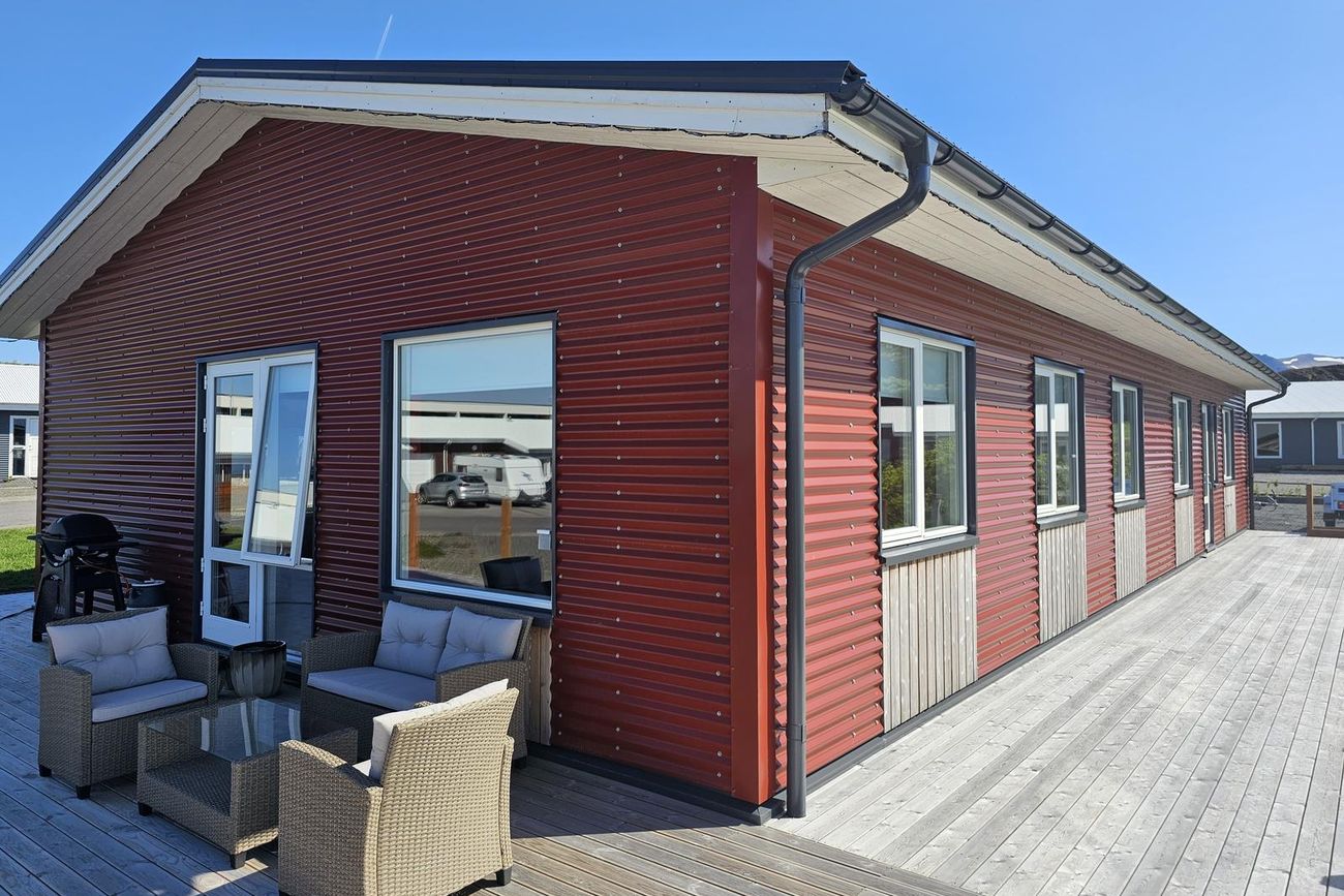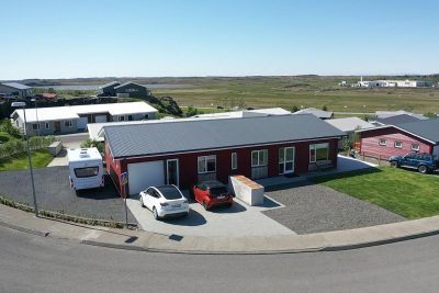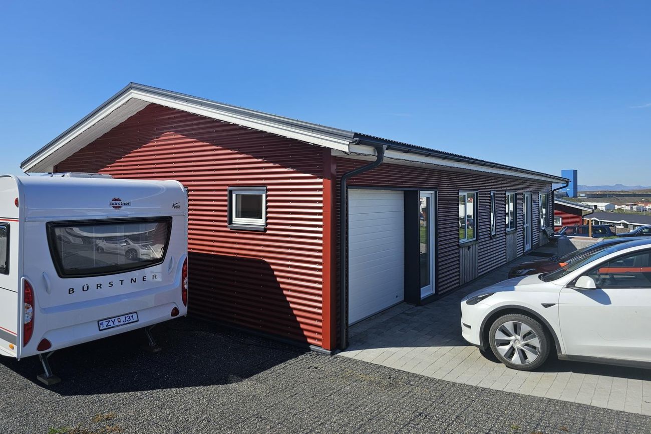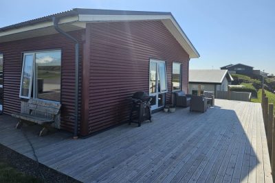 Um er að ræða timburhús á steyptum grunni. Það er klætt að utan með lituðu báruáli, þak er með lituðu stáli og með góðum þakhalla. Þakkantur -rennur og niðurfallsrör smekklega frá gengin. Gráir litatónar á þaki, rústrautt báruál og lerki undir gluggum.