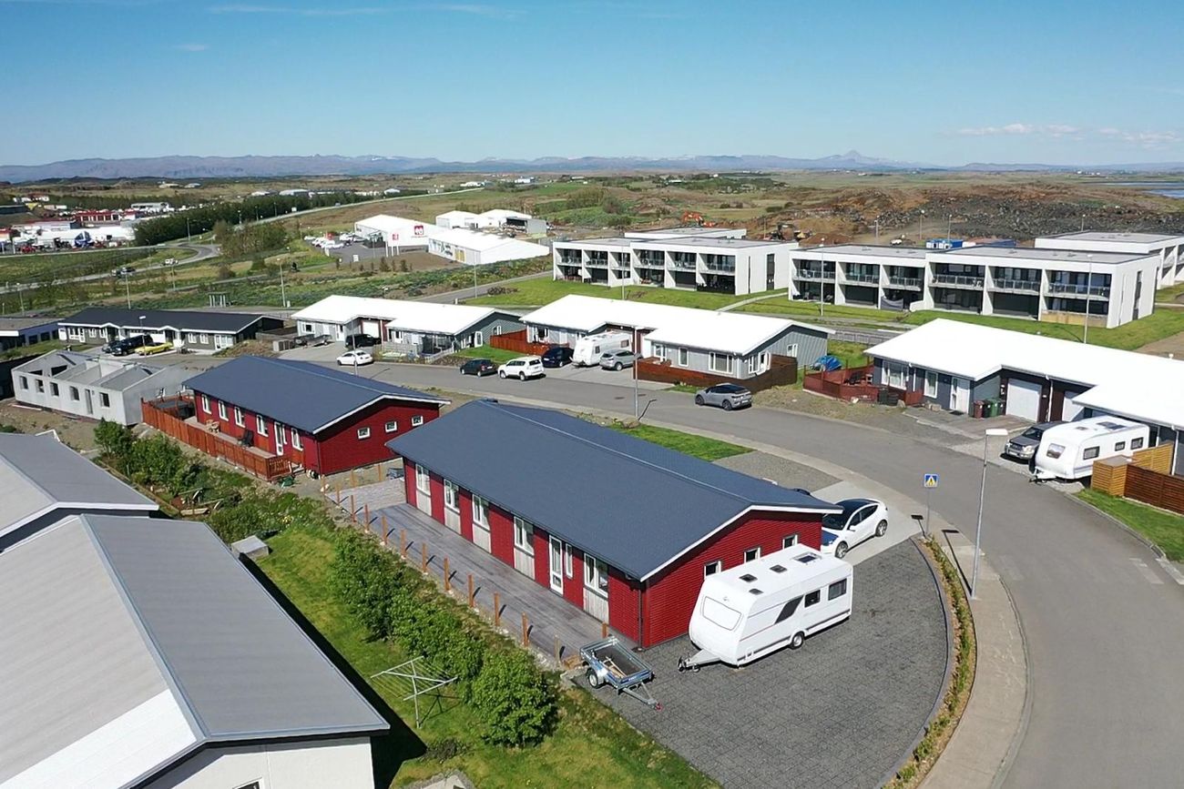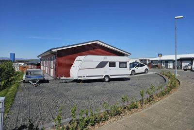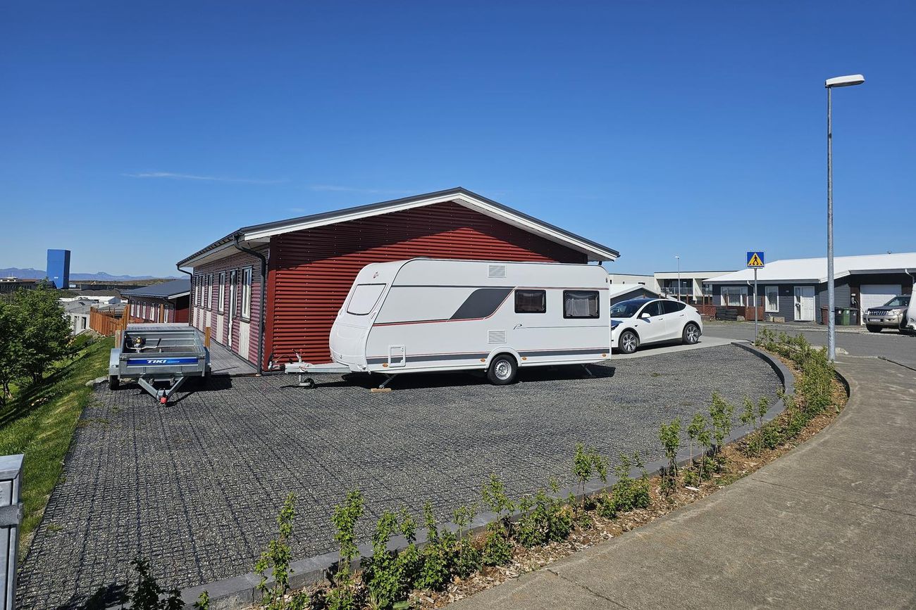 Lóð og bílastæði er fullfrágengið. Bílastæði er hellulagt og gangstétt meðfram húsinu. Ecoraster jarðvegsgrind með möl í austuhluta lóðarinnar, hentugt sem auka bílastæði. Að öðru leyti er grasflatir og möl ásamt trágróðri.