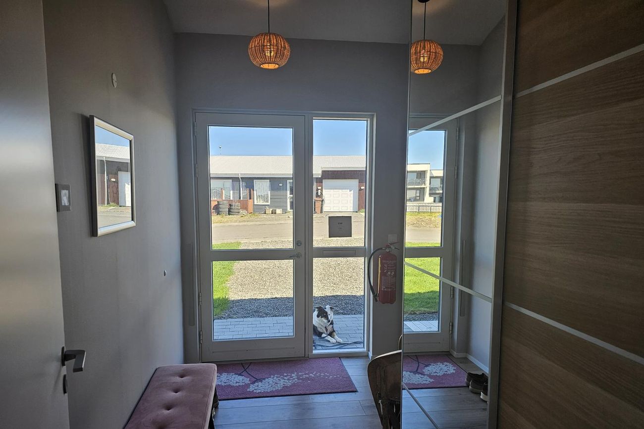 Gengið er inn í rúmgóða forstofu. Þar á vinstri hönd er forstofuherbergi. Inn af forstofu er alrými sem samanstendur af eldhúsi, borðstofu og stofu, upptekin loft, góðum gluggum og góðu útsýni. Gengt er úr stofu út á sólpall. 3 svefnherbergi og baðherbergi eru á svefnherbergisálmu. Þvotttahús er þar innaf. Gengt er úr þvottahúsi út á sólpall og einnig er innangegnt þaðan í bílskúr en inn af honum er geymsla.