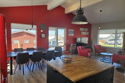 Stofa og borðstofa: Parket á gólfum upptekin loft, gengt út á sólpall.