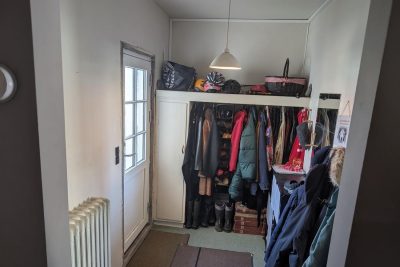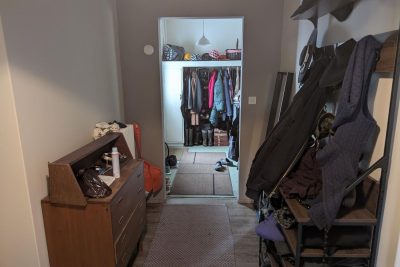 Forstofa: Teppi á gólfi og opinn fataskápur.