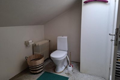 Snyrting: Dúkur á gólfi, salerni og innrétting með skápum á vegg.
