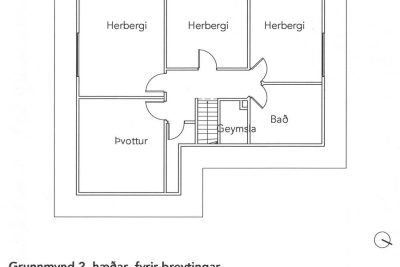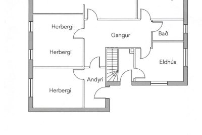 Gengið er í forstofu. Þar á vinstri hönd er forstofuherbergi. Úr forstofu er gengið inn á gang sem tengir saman öll rými á hæðinnien þar eru 2 svefnherbergi, 2 stofur, snyrting og eldhús. Gengið er upp stiga af stigapalli inn á gang á rishæð, þar eru 3 svefnherbergi, baðherbergi og þvottahús. Bílskúr er stakstæður.