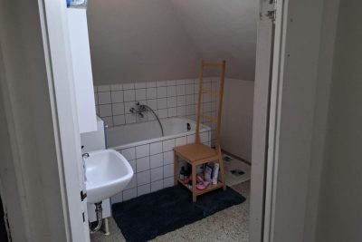 Baðherbergi: Baðkar, salerni og lítil innrétting.