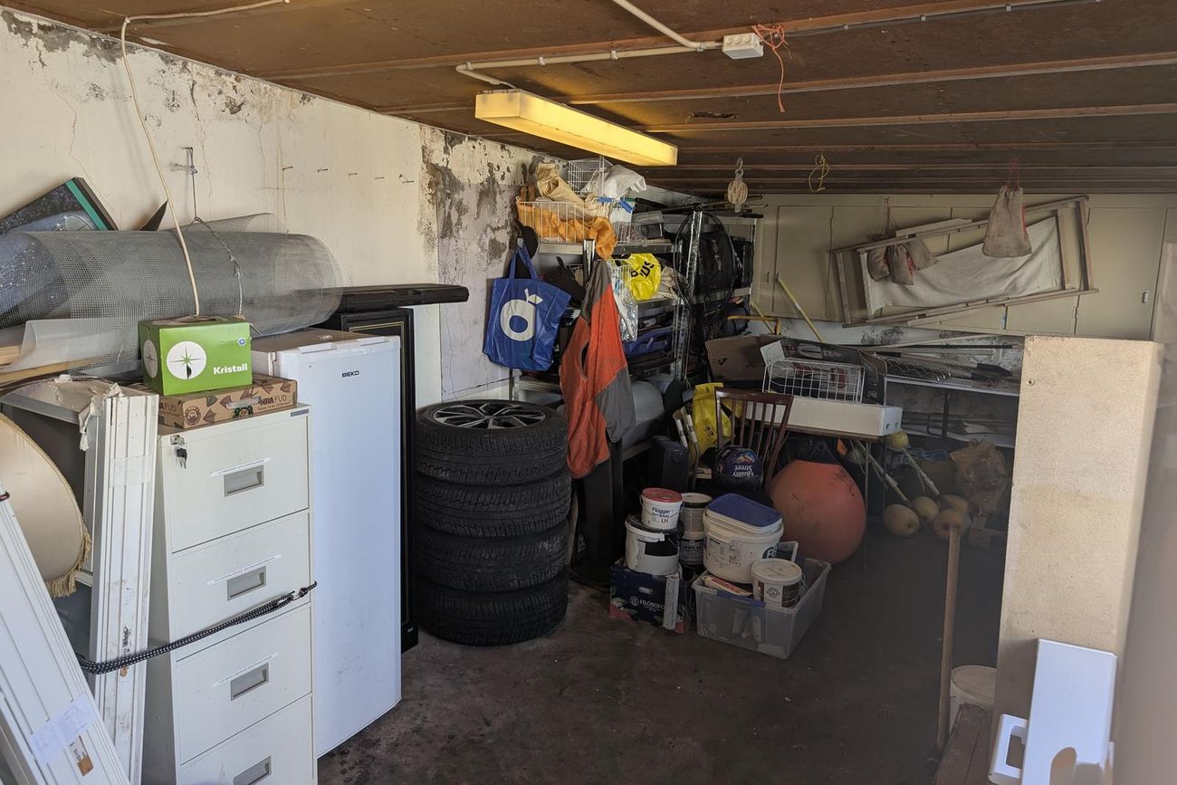 Bílskúr: Steypt gólf, eldri bílskúrshurð.