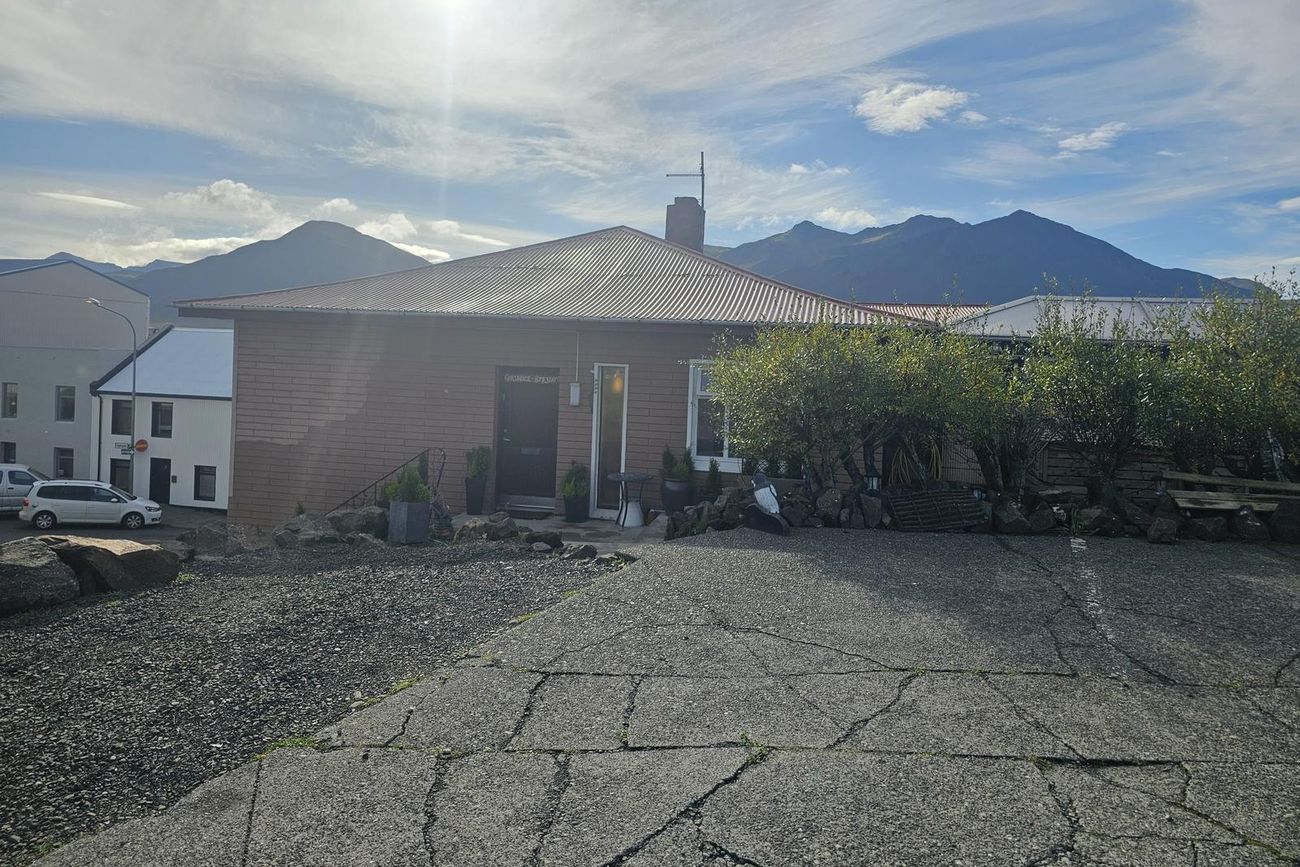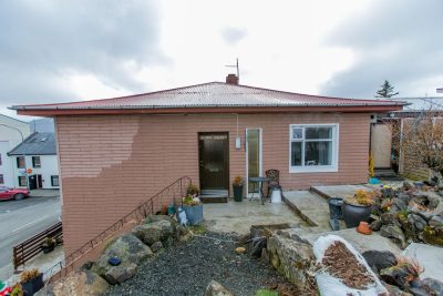 Lóðin er skemmtilega frágengin með grjóthleðslu og steyptum stéttum og sér bílastæði við íbúð á efri hæð. Klæðning á útveggjum og gluggar er komið til ára sinna.