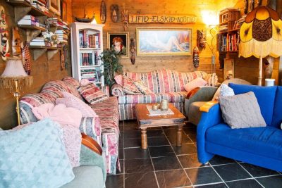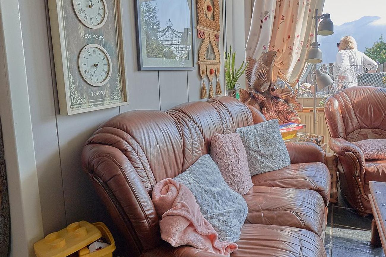Hæðin er innréttuð með viðarklæðningu á veggjum að hluta og flísum og parket á gólfum.