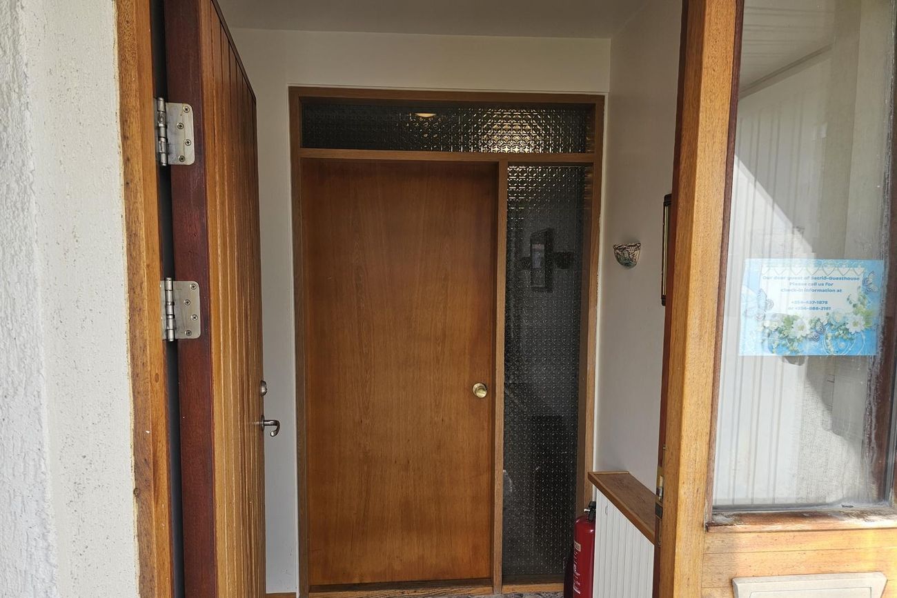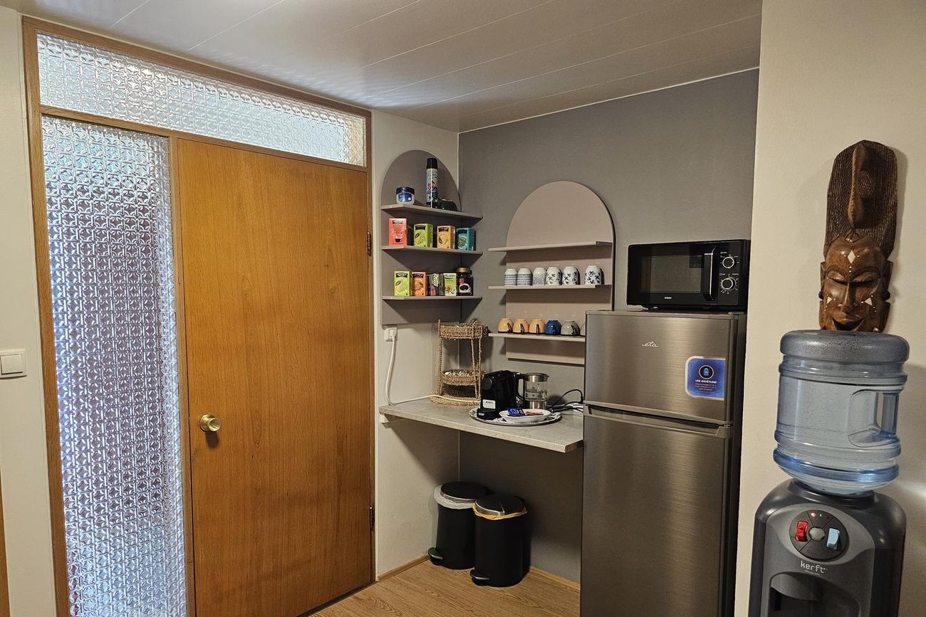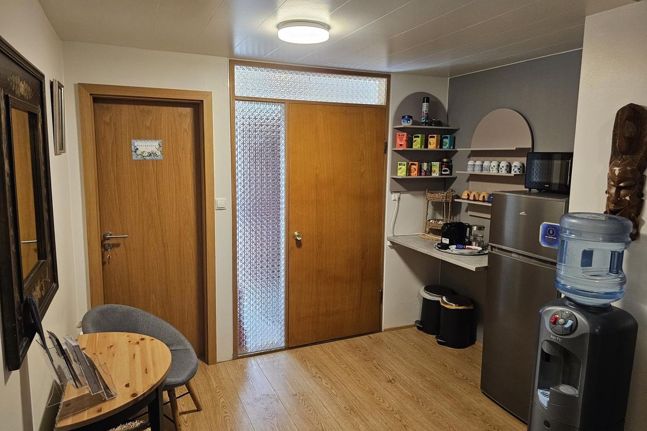 Herbergi með parketi á gólfi og skáp. Þar innaf er lítil snyrting með dúk á gólfi.