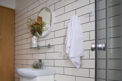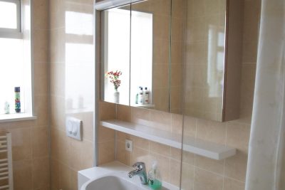 Baðherbergi: Marmaraflísar á gólfi og flísar á veggjum, innrétting og sturtuklefi.