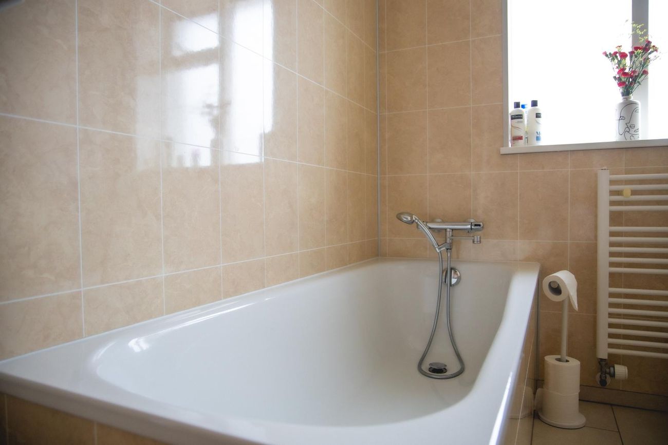 Baðherbergi 1: Flísalagt í hólf og gólf, baðinnrétting með upphengdum vaski og speglaskáp, baðkar, vegghengt salerni og walk-in sturta .