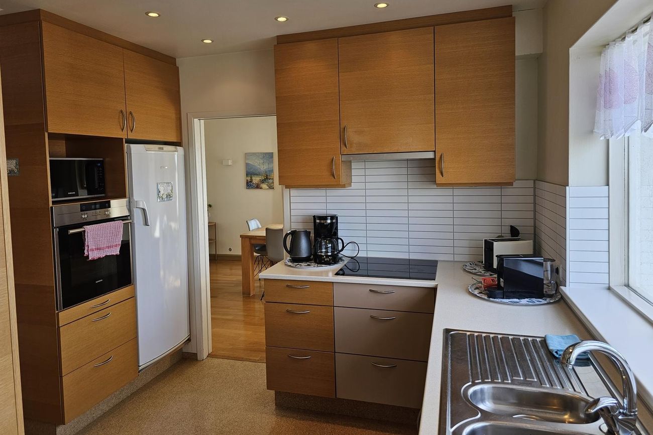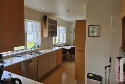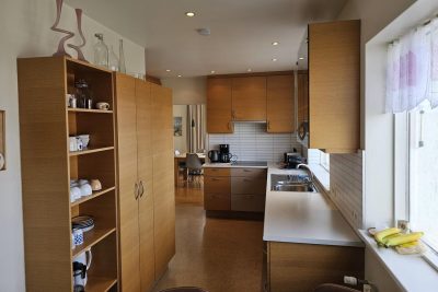 Eldhús: Korkflísar á gólfi, rúmóðri innrétting með góðu geysmlu og vinnuplássi, helluborð og uppþvottavél.