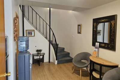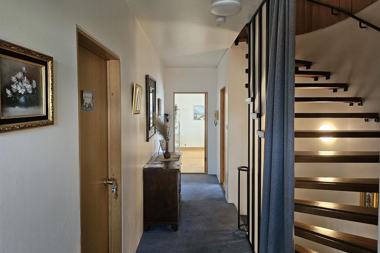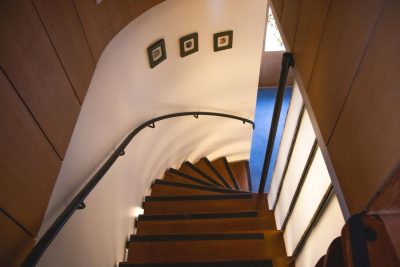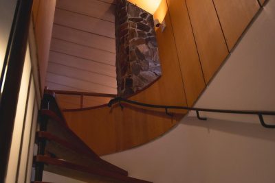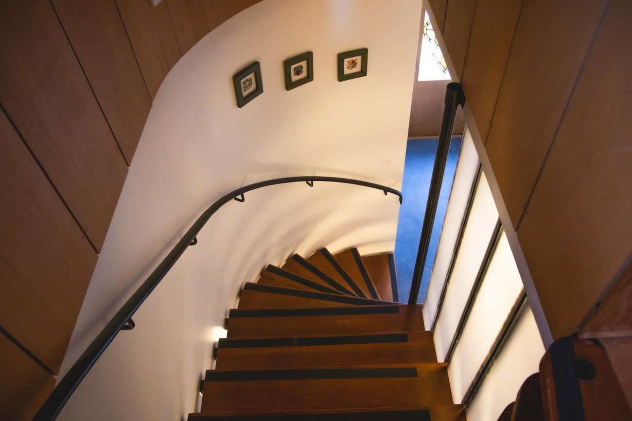 Gengið er um bogadreginn steyptan stiga upp á hæðina.