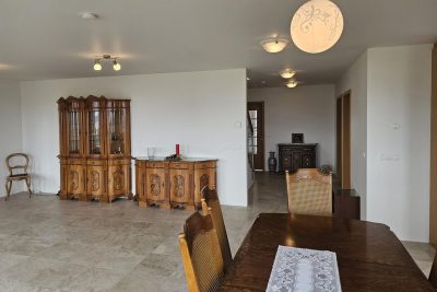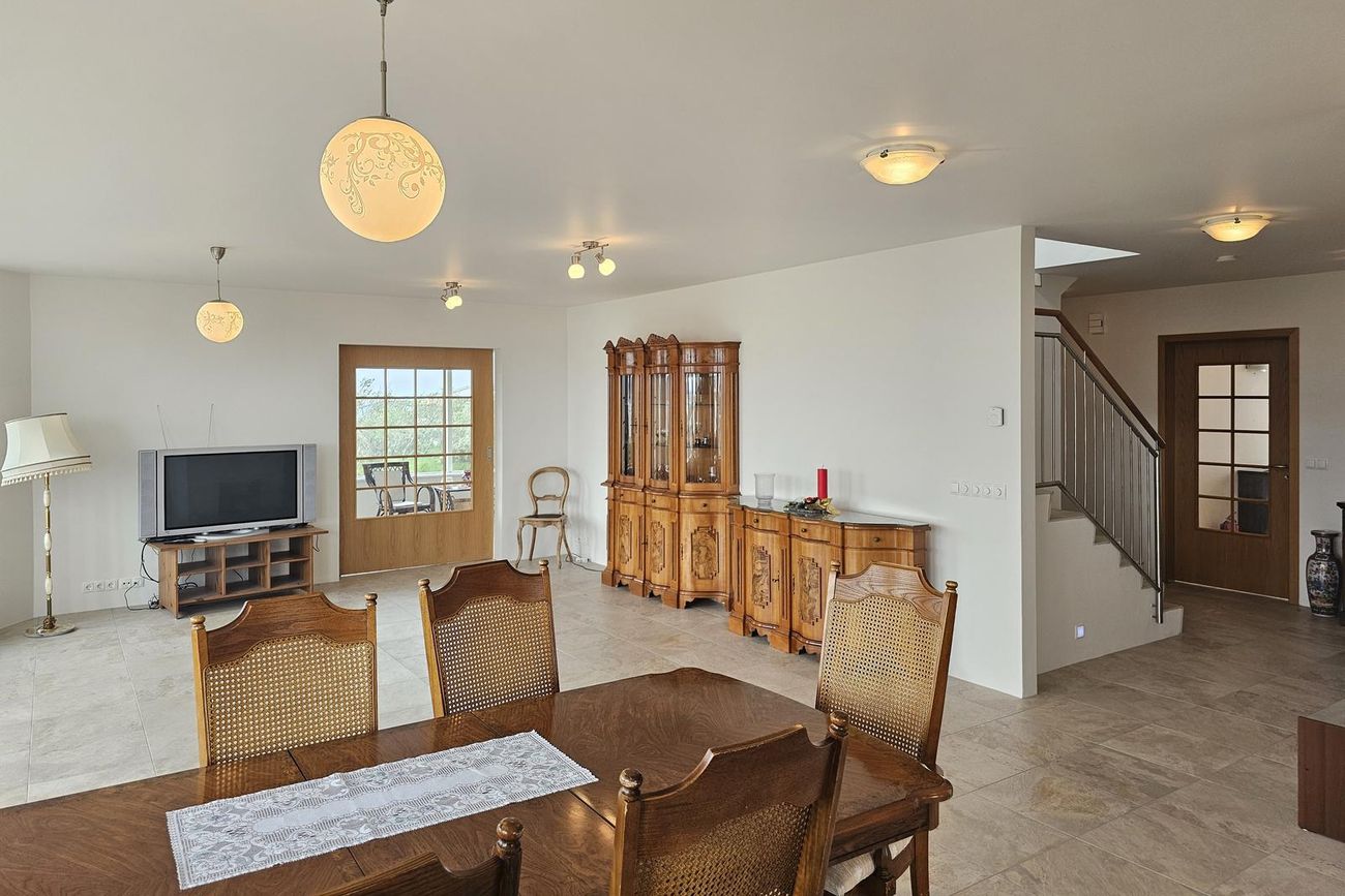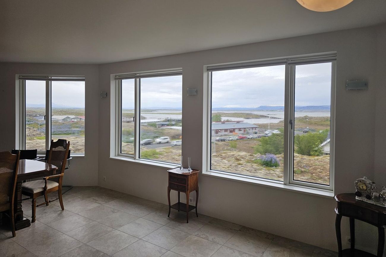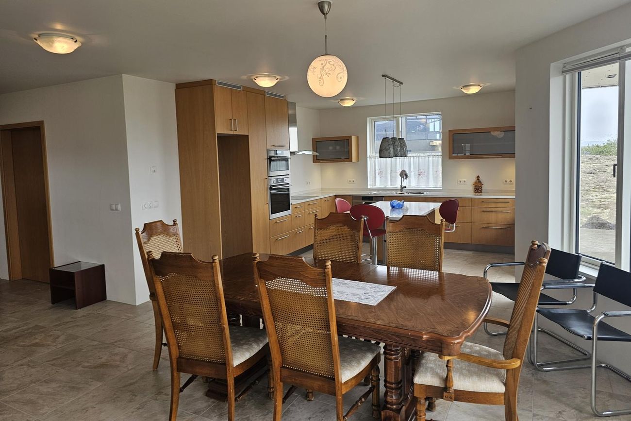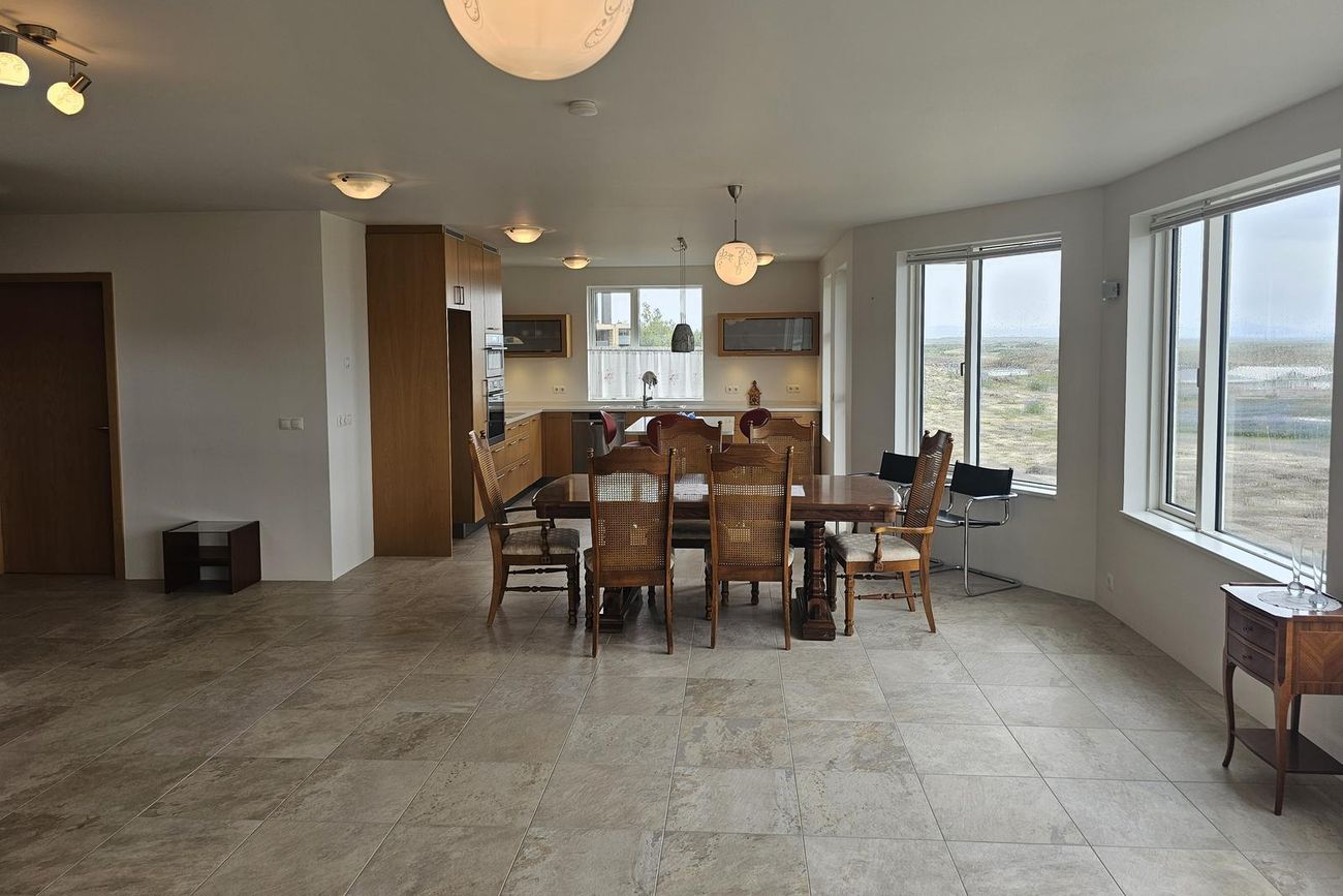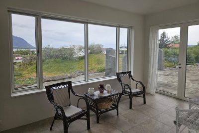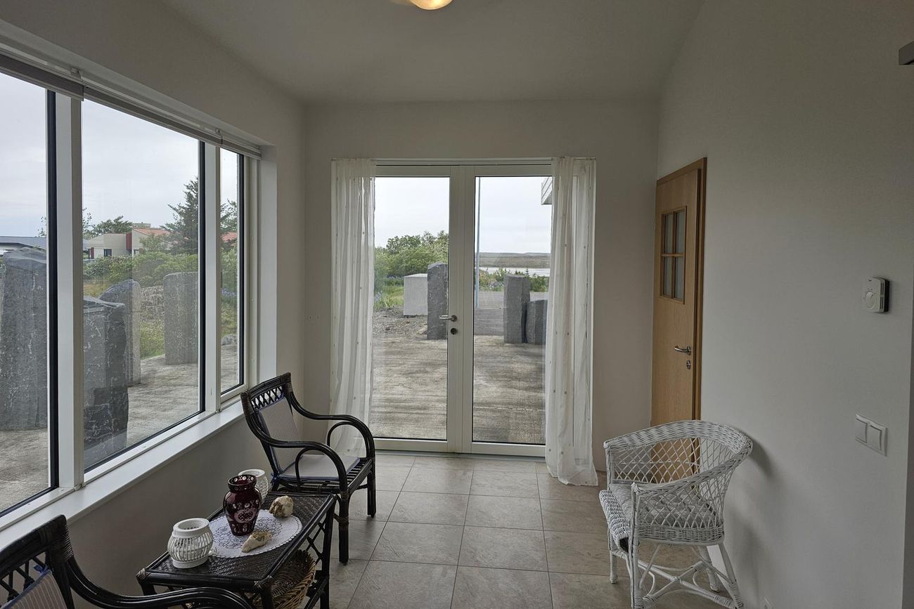 Sólstofa: Mikið útsýni og þaðan er gengt út á steypta verönd. Einnig innangengt um veglega rennihurð með frönskum gluggum í stofuna.