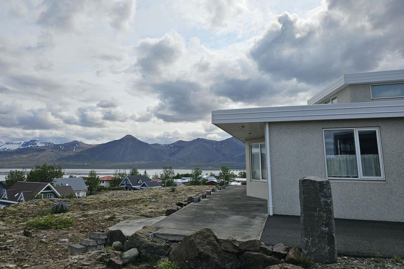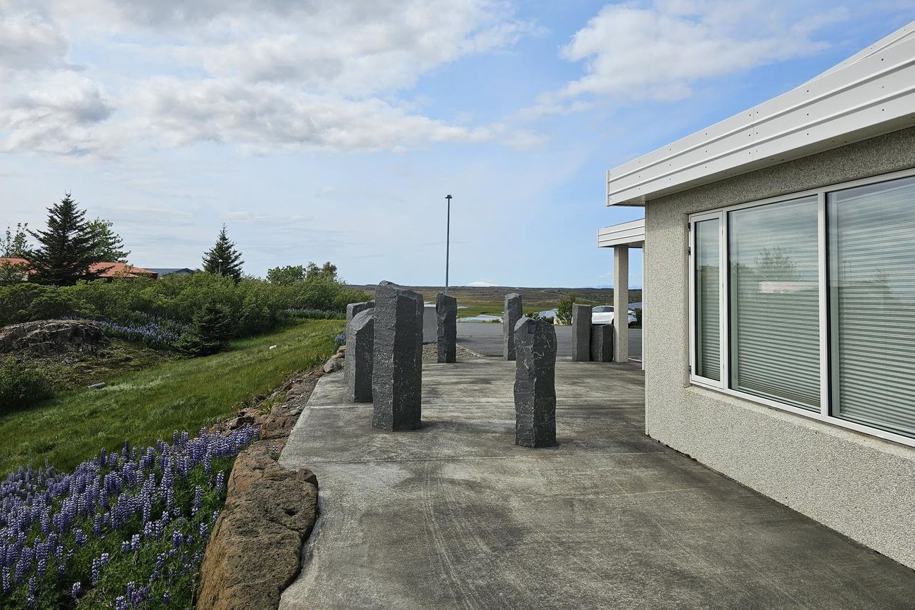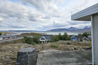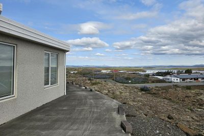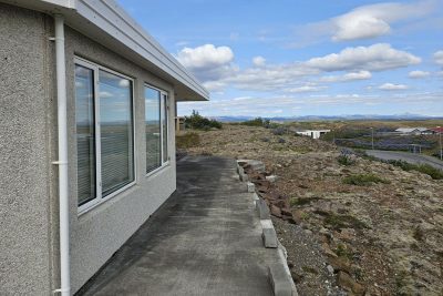 Umhverfi hússins er allt frágengið. Bílaplan er malbikað og hellulögð stétt við útidýr. Steypt stétt og verönd er með öðrum hliðum hússins. Lagt er fyrir heitum potti á veröndinni. Húsið stendur hátt og er lóðin mjög sérstök þar sem klappir og holtagrjót er í bland.
