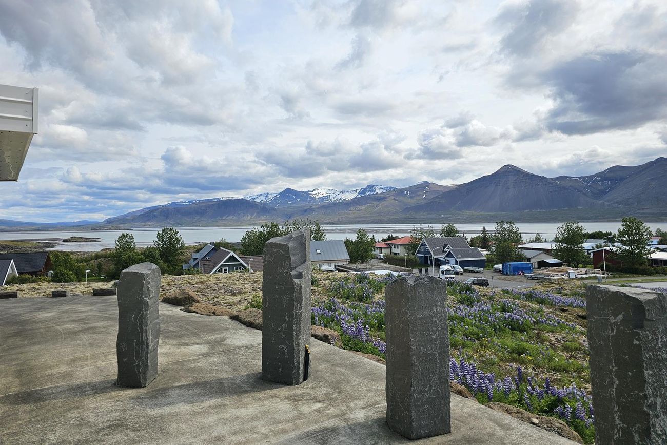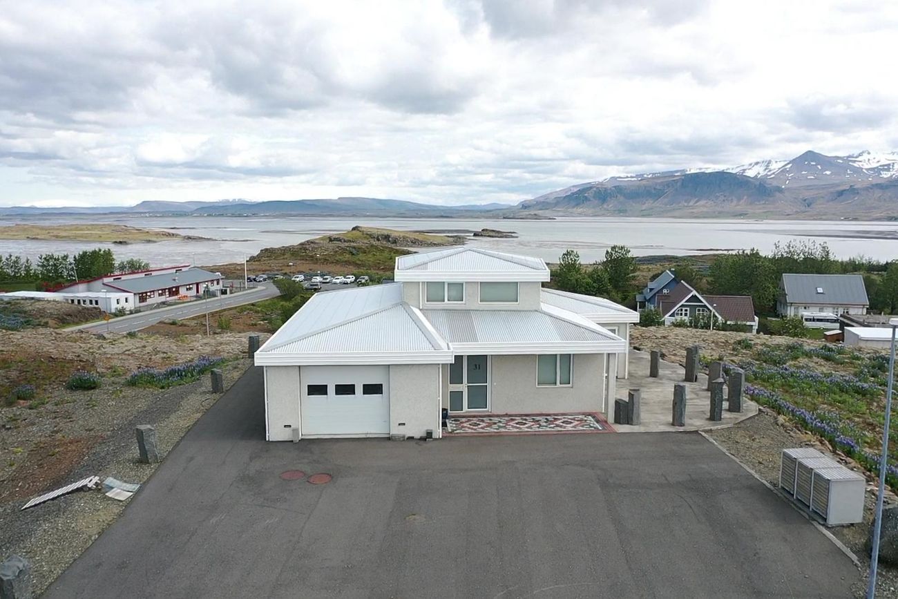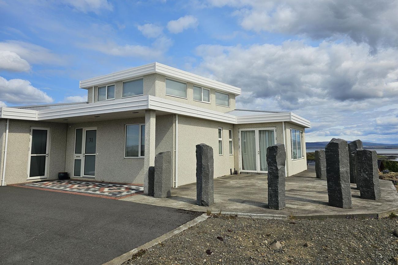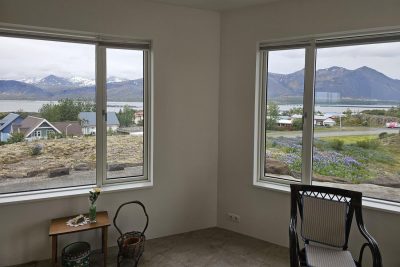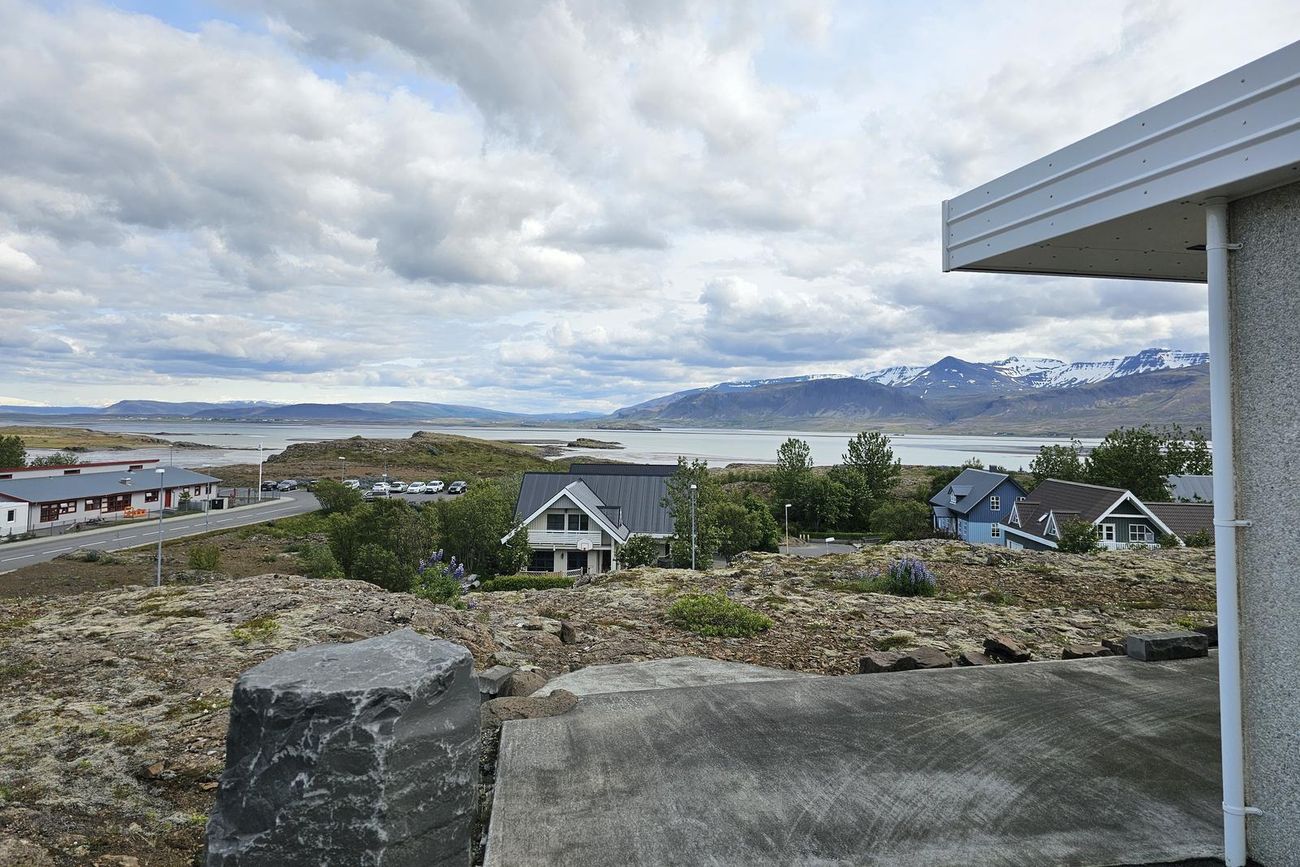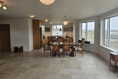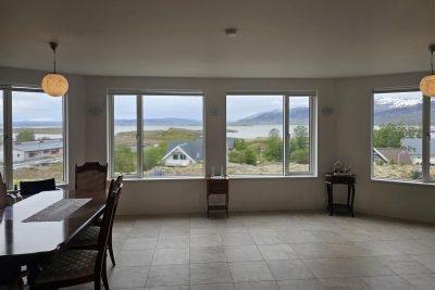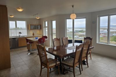 Stofur: Eru bjartar og rúmgóðar með miklu útsýni yfir Borgarfjörð. Úr borðstofunni er gengið út á steypta veröndina.