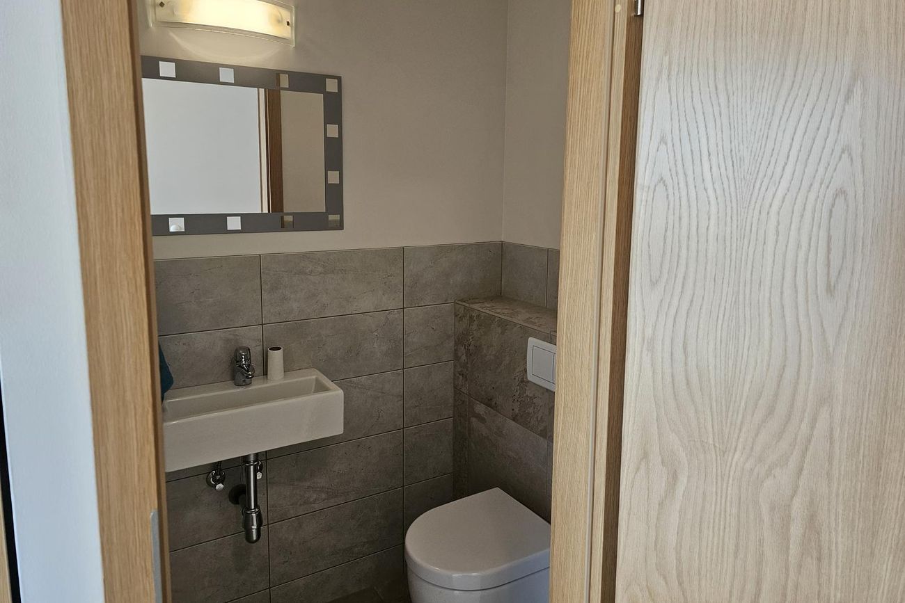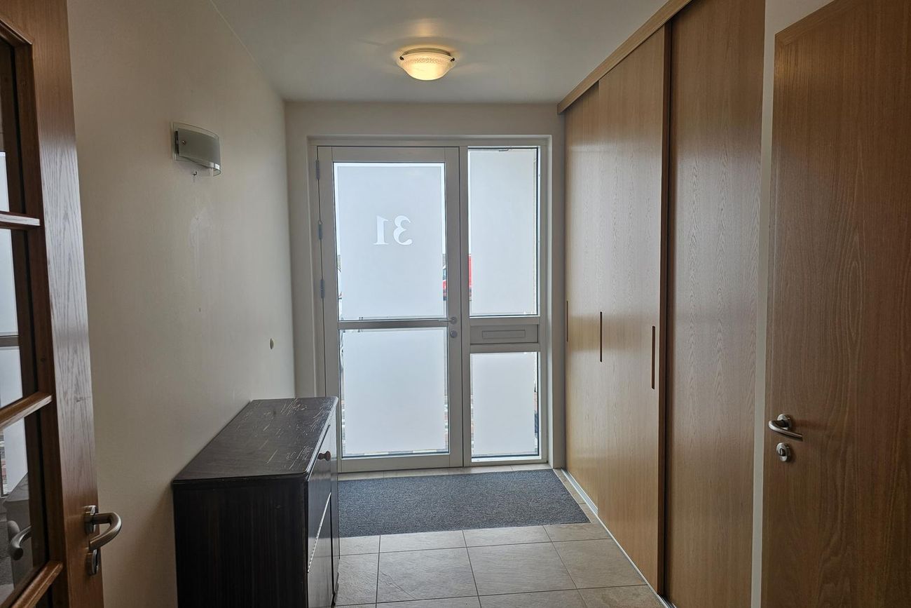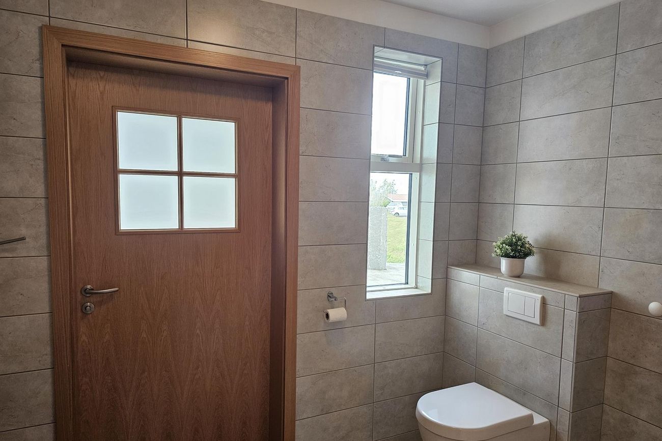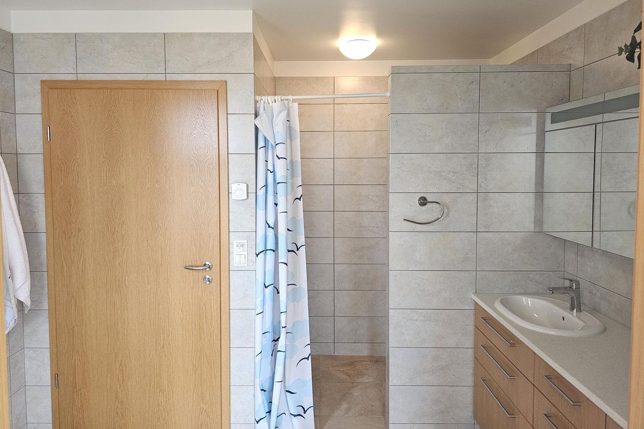 Gestasnyrting: Er inn af anddyri. Spegill yfir vaski, flísar á veggjum og vegghengt salerni.
