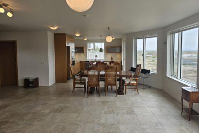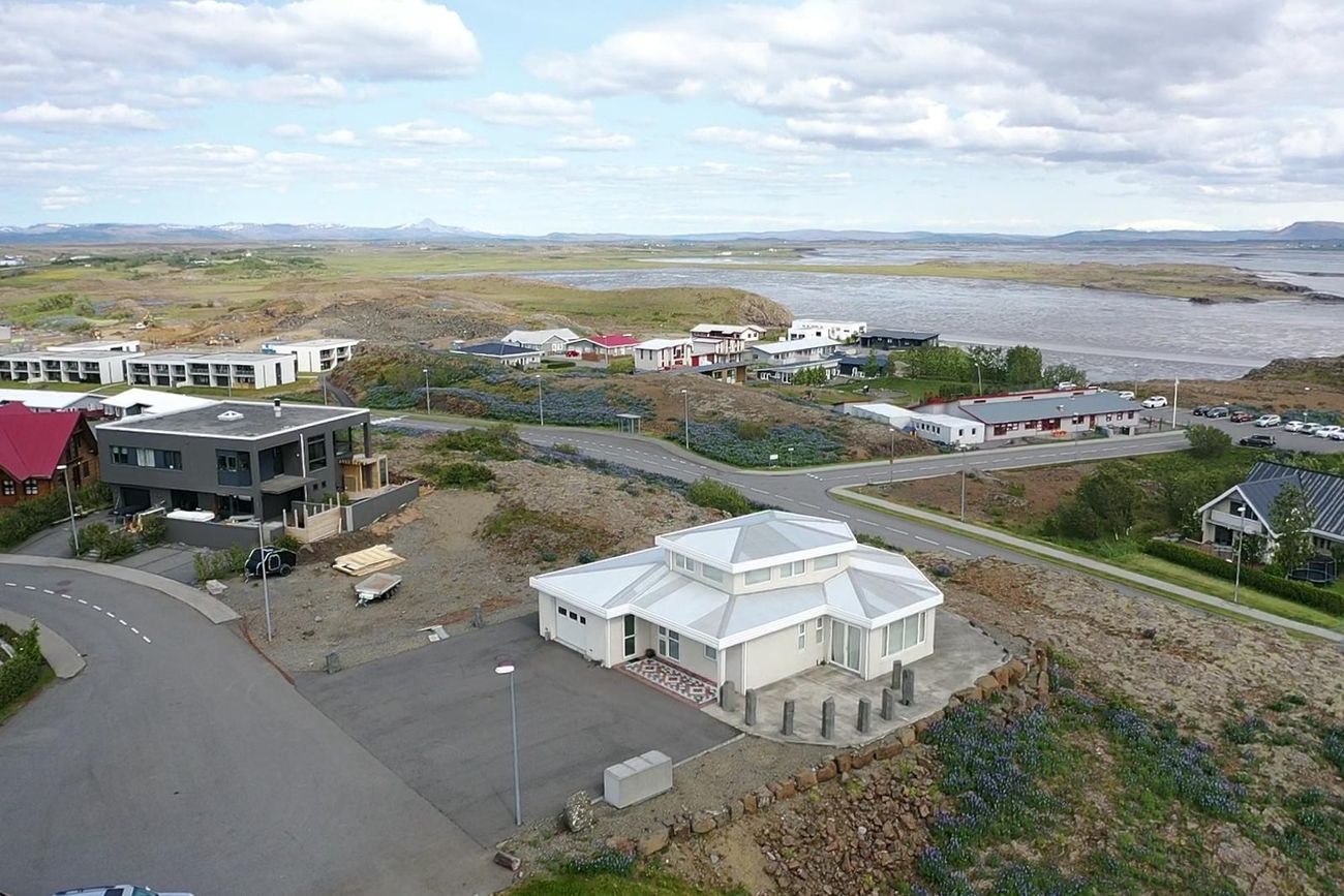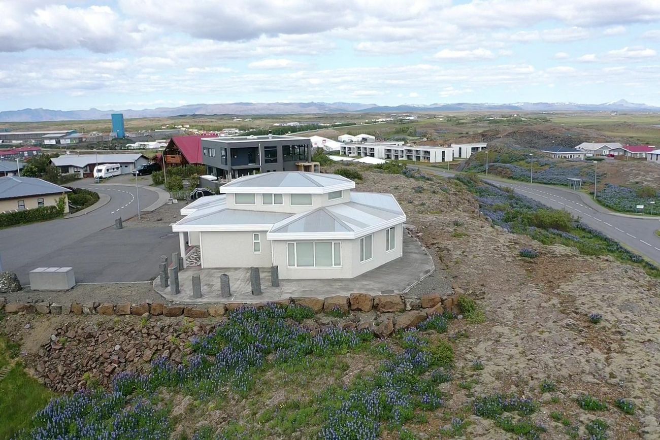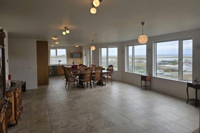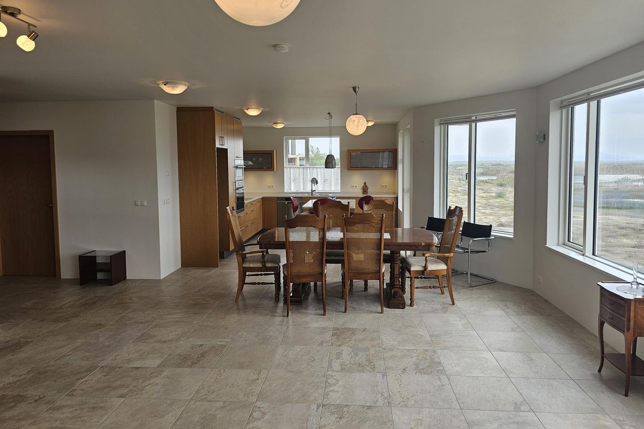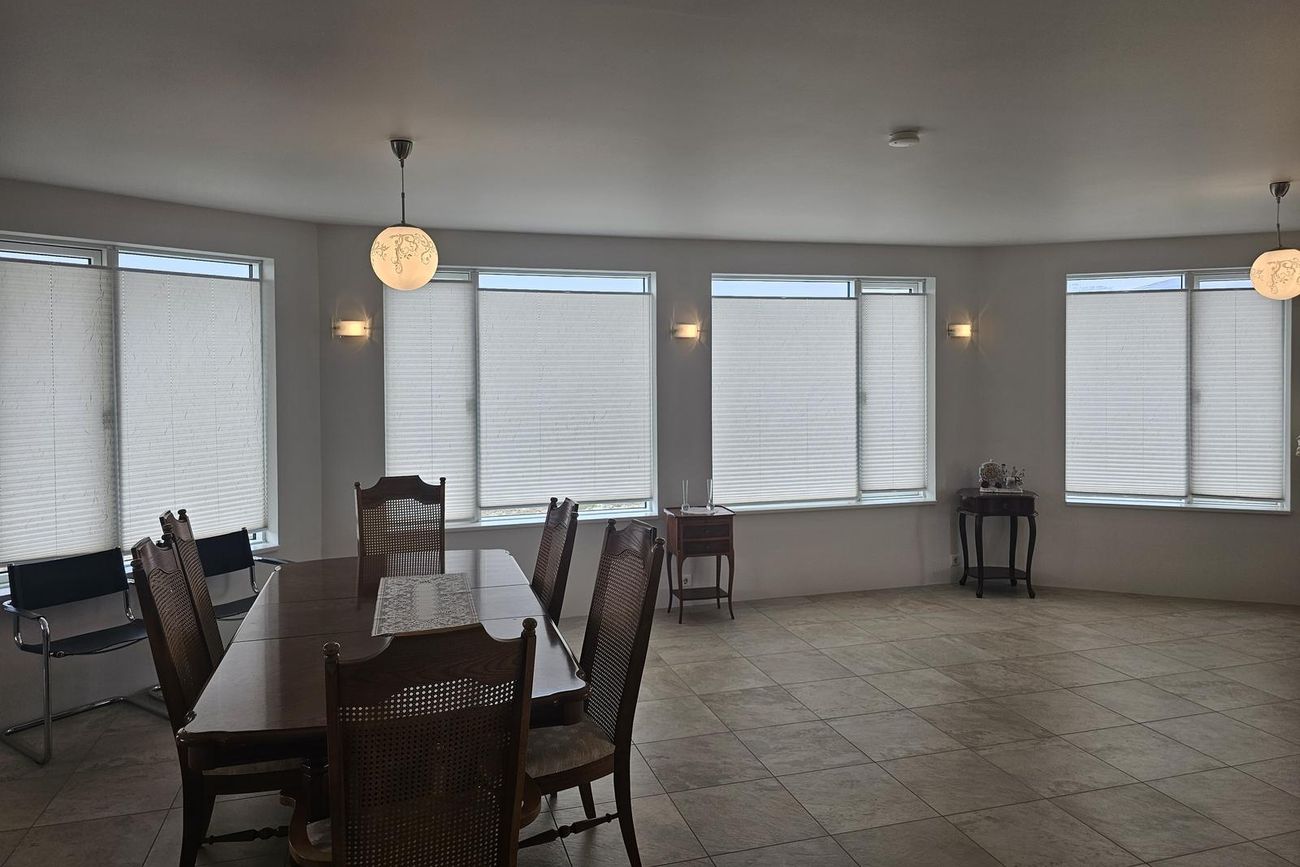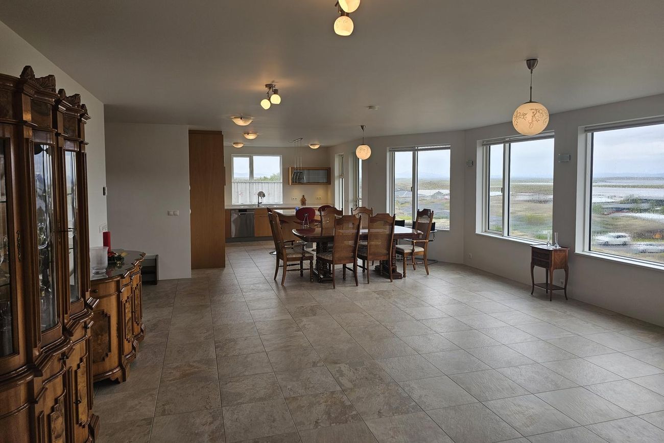 Húsið skiptist í anddyri, hol, gestasnyrtingu, stofa og eldhús mynda alrými, tvö svefnherbergi, sólstofu, baðherbergi, þvottahús og bílskúr. Á efri hæðinni er 46,6 fm alrými með 360° útsýni. Öll gólf í íbúðinni eru flísalögð með gólfhita. Varmaskiptir er á neysluvatni. Allar innréttingar eru sérsmíðaðar með vönduðum hætti. Vönduð gluggatjöld fylgja frá Zeta Brautum. Næturlýsing er bæði innan húss og utan.