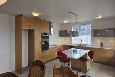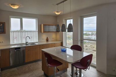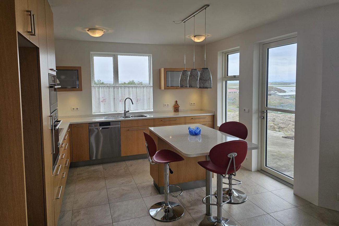 Eldhús: Vönduð og rúmgóð innrétting (eik). Eyja með skápum og borði til að matast við. Bakarofn og örbylguofn í vegg og helluboð í borðplötu.