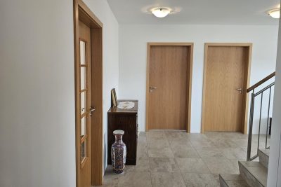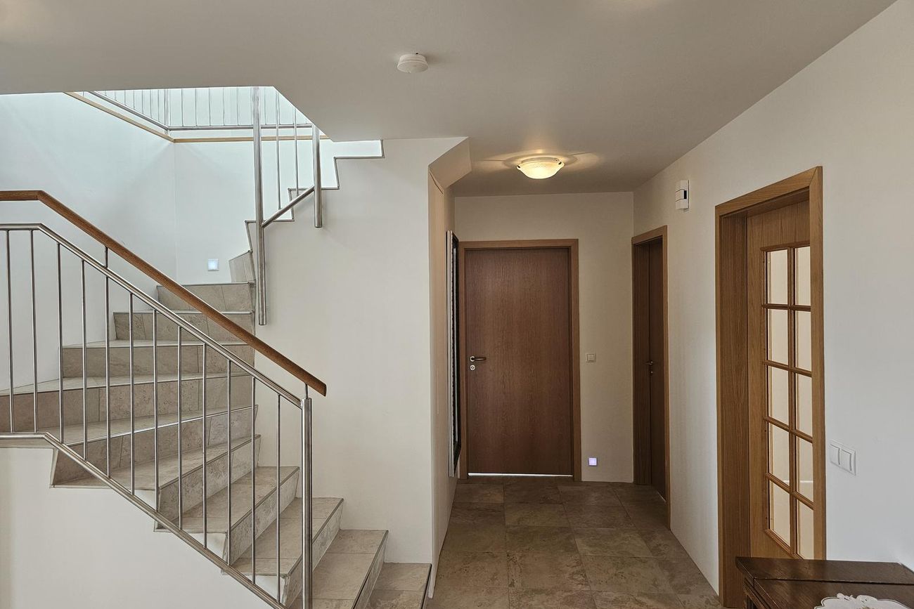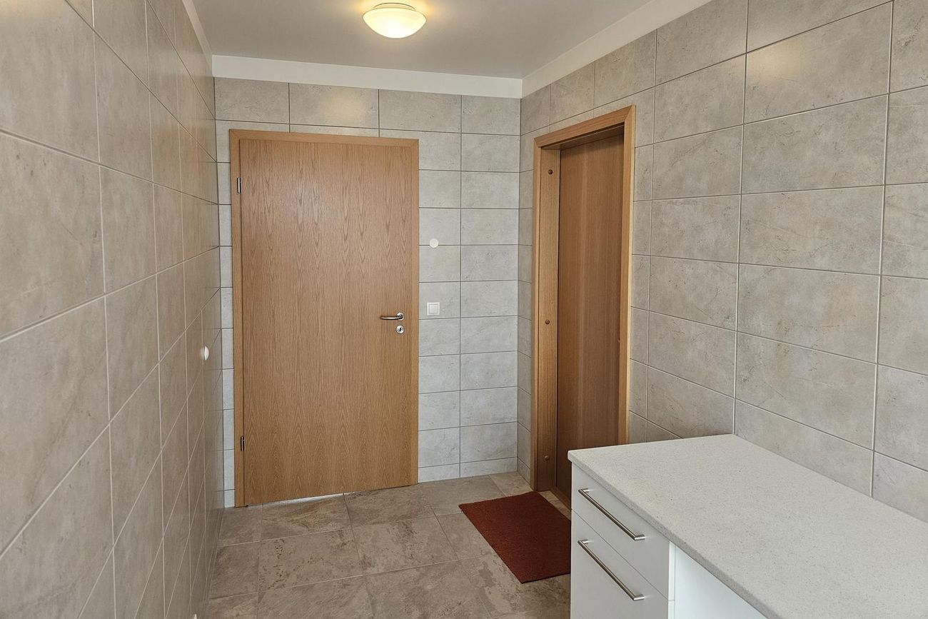 Stigi: Upp á efri hæð er flísalagður, handrið úr ryðfríu stáli og harðviður.