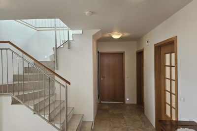 Hol: Þaðan er gengið upp flísalagðar tröppur á efri hæðina og í herbergi, baðherbergi og alrými og þvottahús.