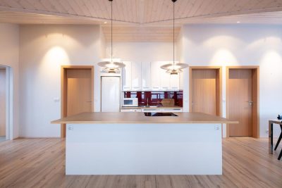 Húsið er timburhús, staðbyggt og er klætt með áli í bland við harðvið. Innveggir eru gifsklæddir og málaðir en loft upptekin og klædd hvíttaðri furu.