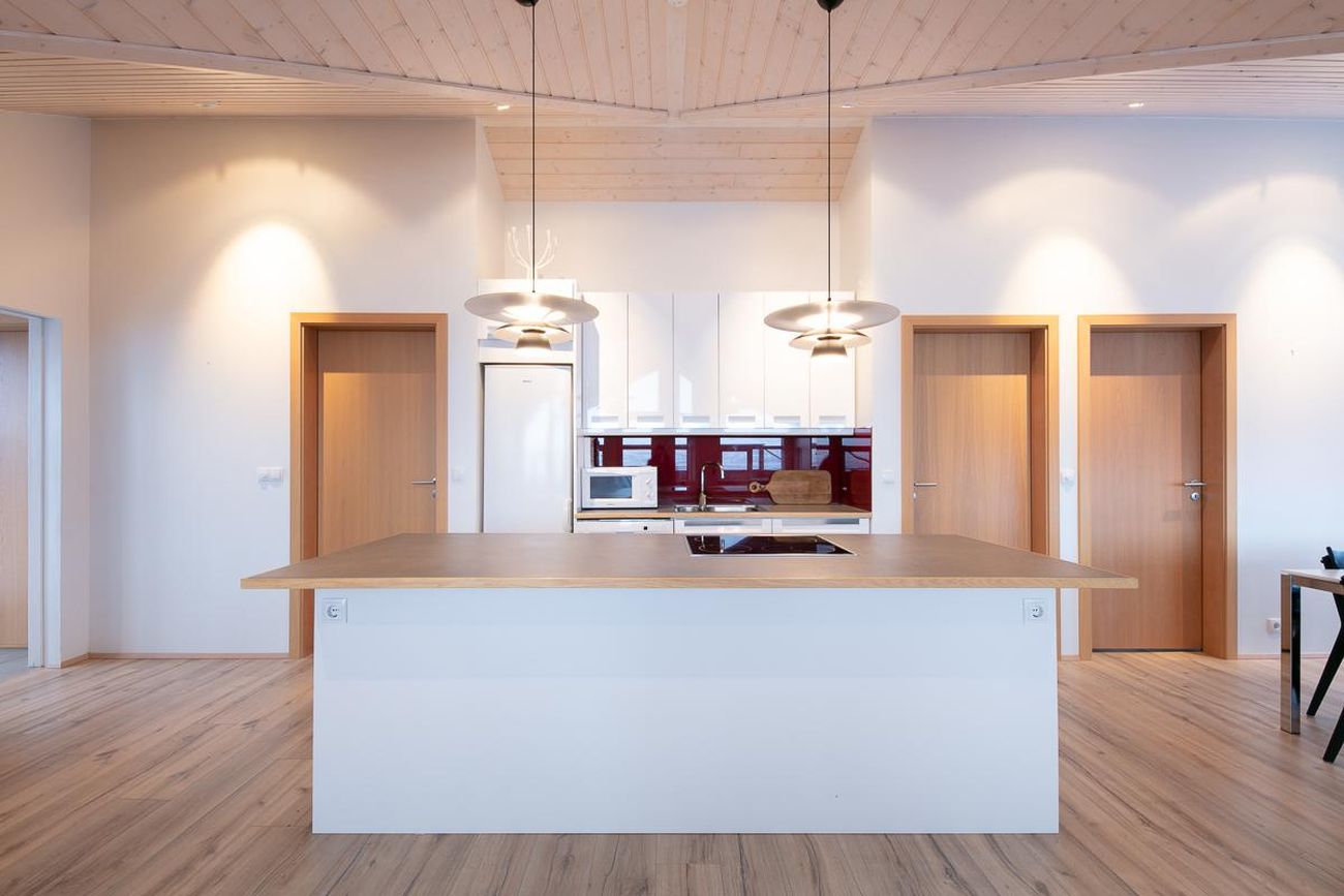 Úr forstofu er gengið inn í stórt og bjart alrými sem samanstendur af eldhúsi, stofu og borðstofu. Eldhúsið er með hvítri innréttingu með innbyggðri uppþvottavél. Eldhúseyja með góðu skúffuplássi, bakarofni og helluborði nýtist einnig sem skenkur sem sitja má við. Lítil borðstofa er til hliðar við eldhúseyjuna Stofan er rúmgóð og björt.