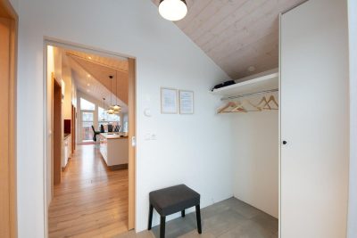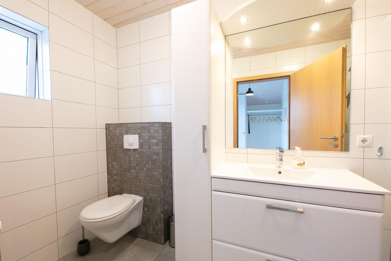 Gengið er í rúmgóða forstofu, flísar á gólfi og fataskápur og fatahengi. Þar er baðherbergi á vinstri hönd, flísalagt í hólf og gólf. Hvít innrétting, walk-in sturta og upphengt salerni.