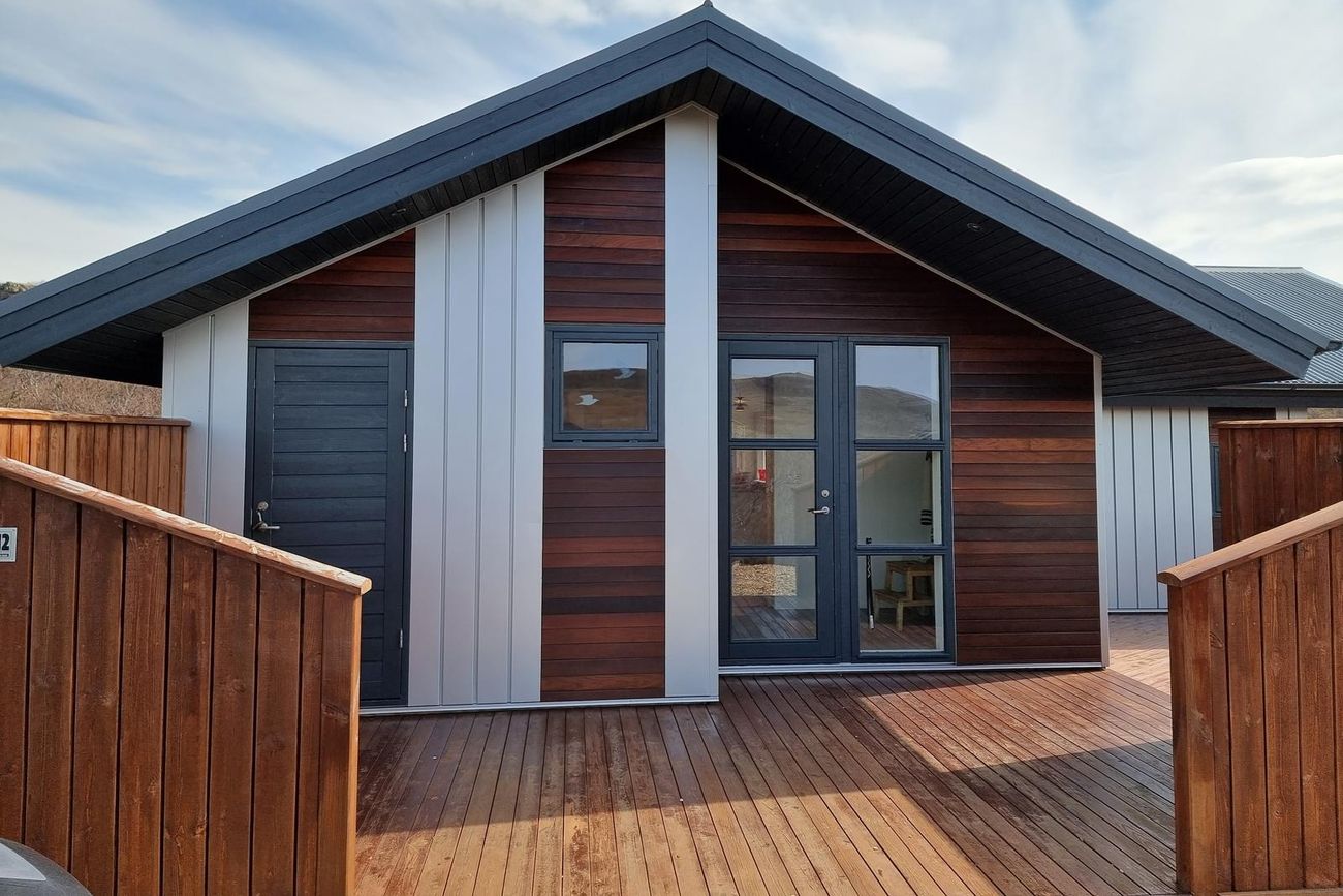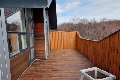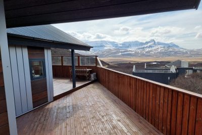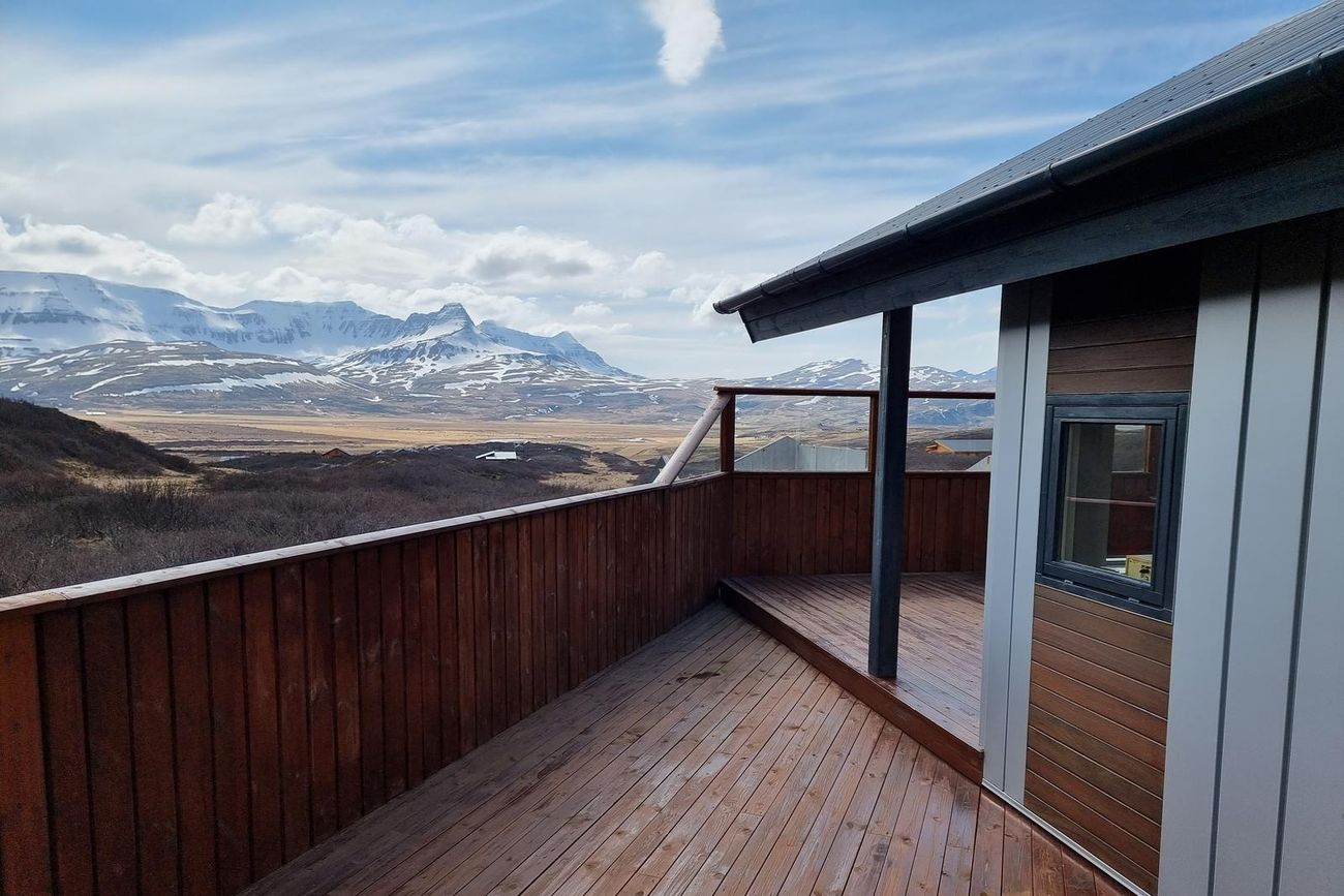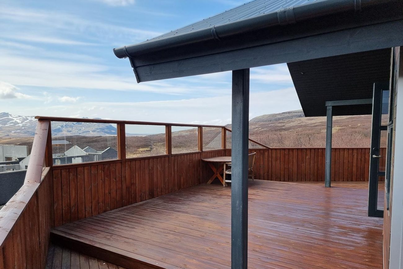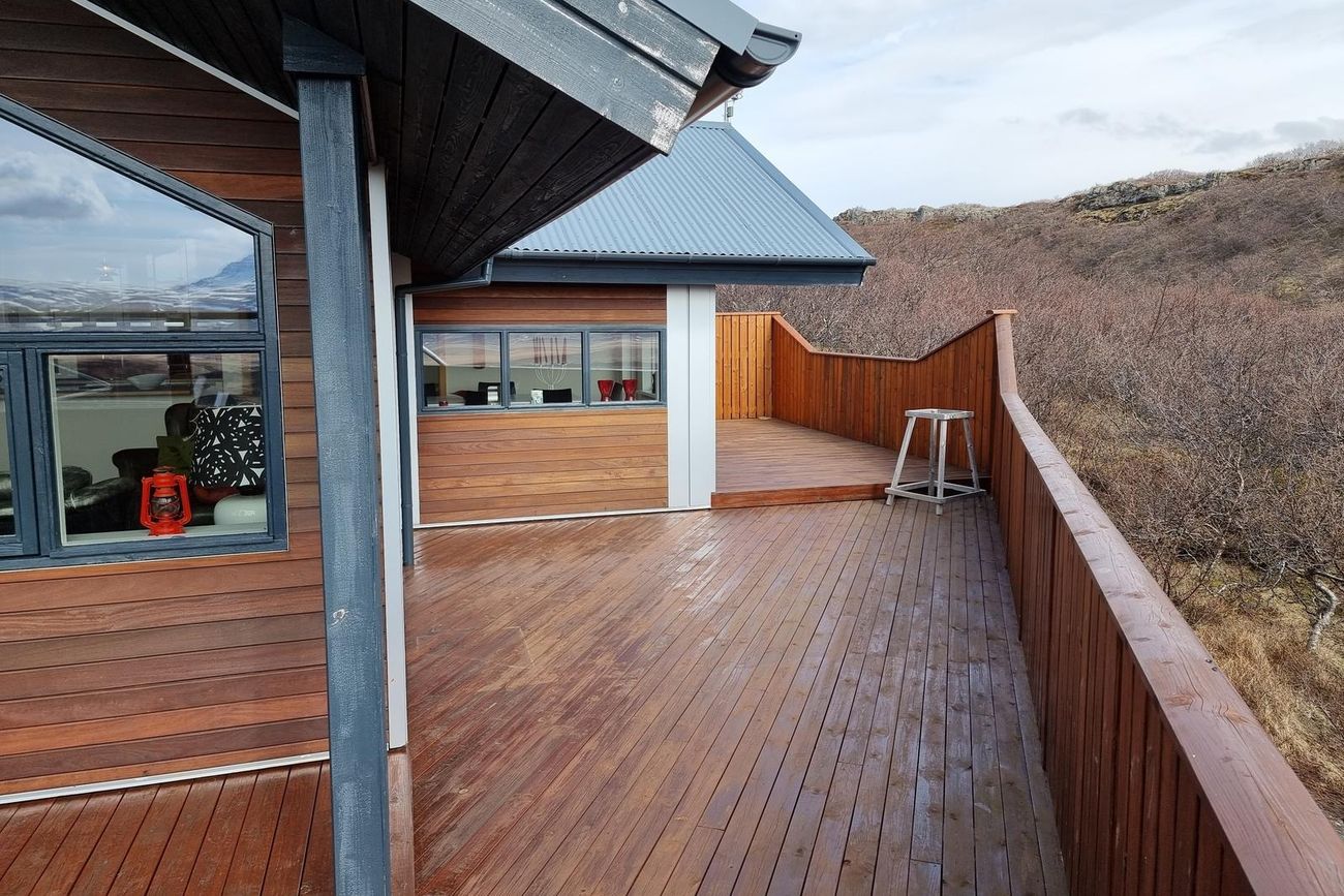 Gengt er úr stofurými út á stóran sólpall með skjólveggjum. Inntak fyrir vatn og rafmagn er í sambyggðri útigeymslu. Þar eru lagnir fyrir þvottavél.