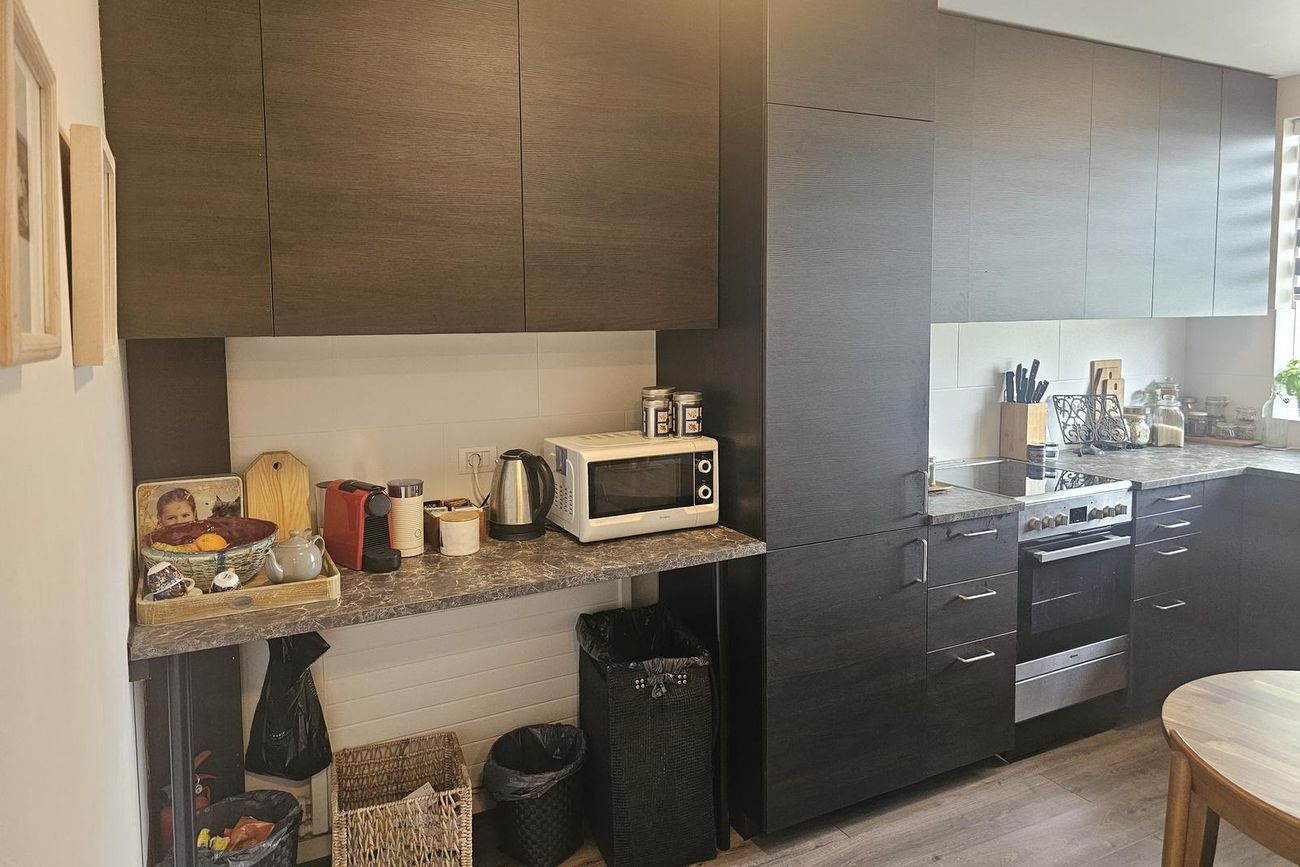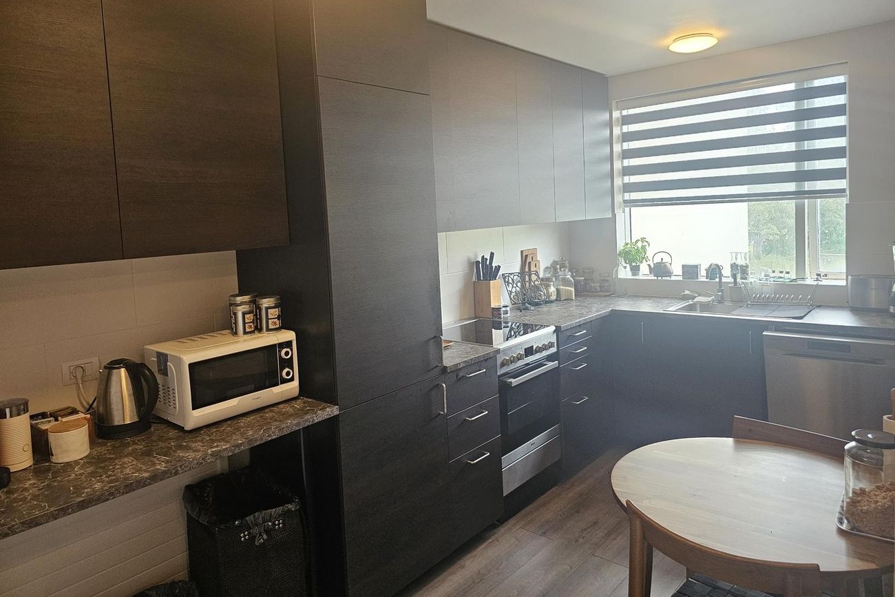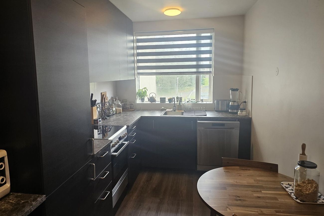 Eldhúsið er nýlega uppgert með dökkri rúmgóðri innréttingu, innbyggð uppþvottavél og kæli- og frystiskápur í innréttingu fylgir.