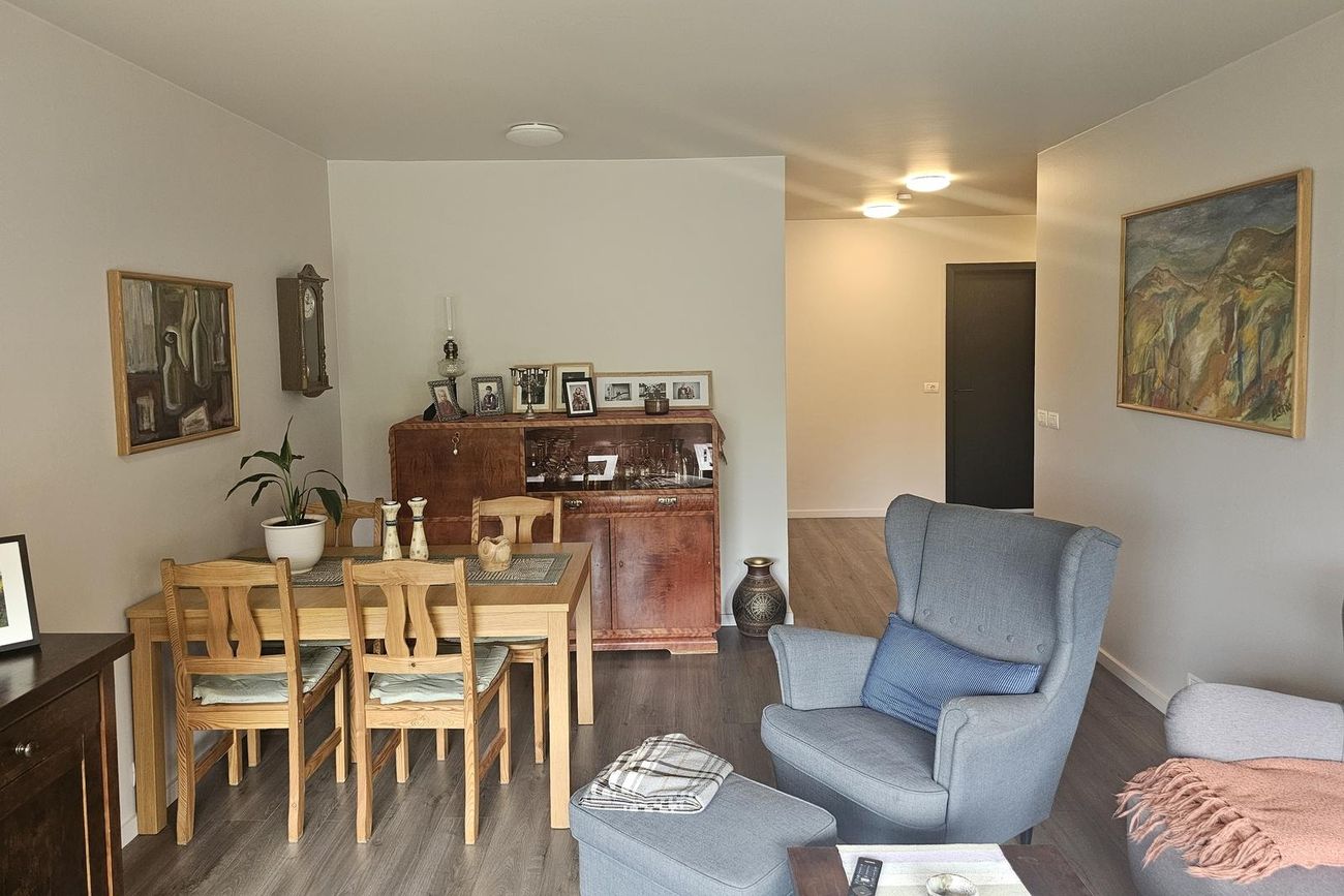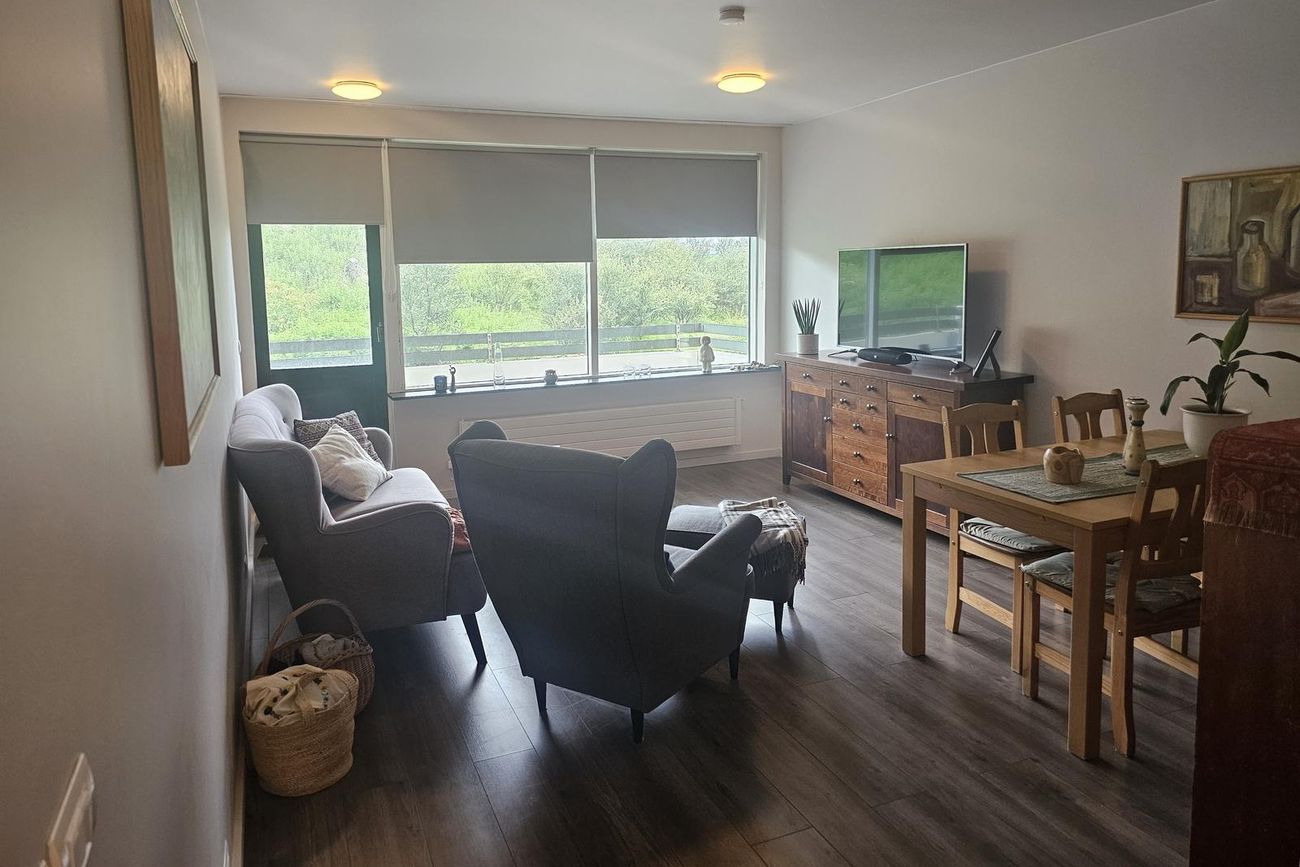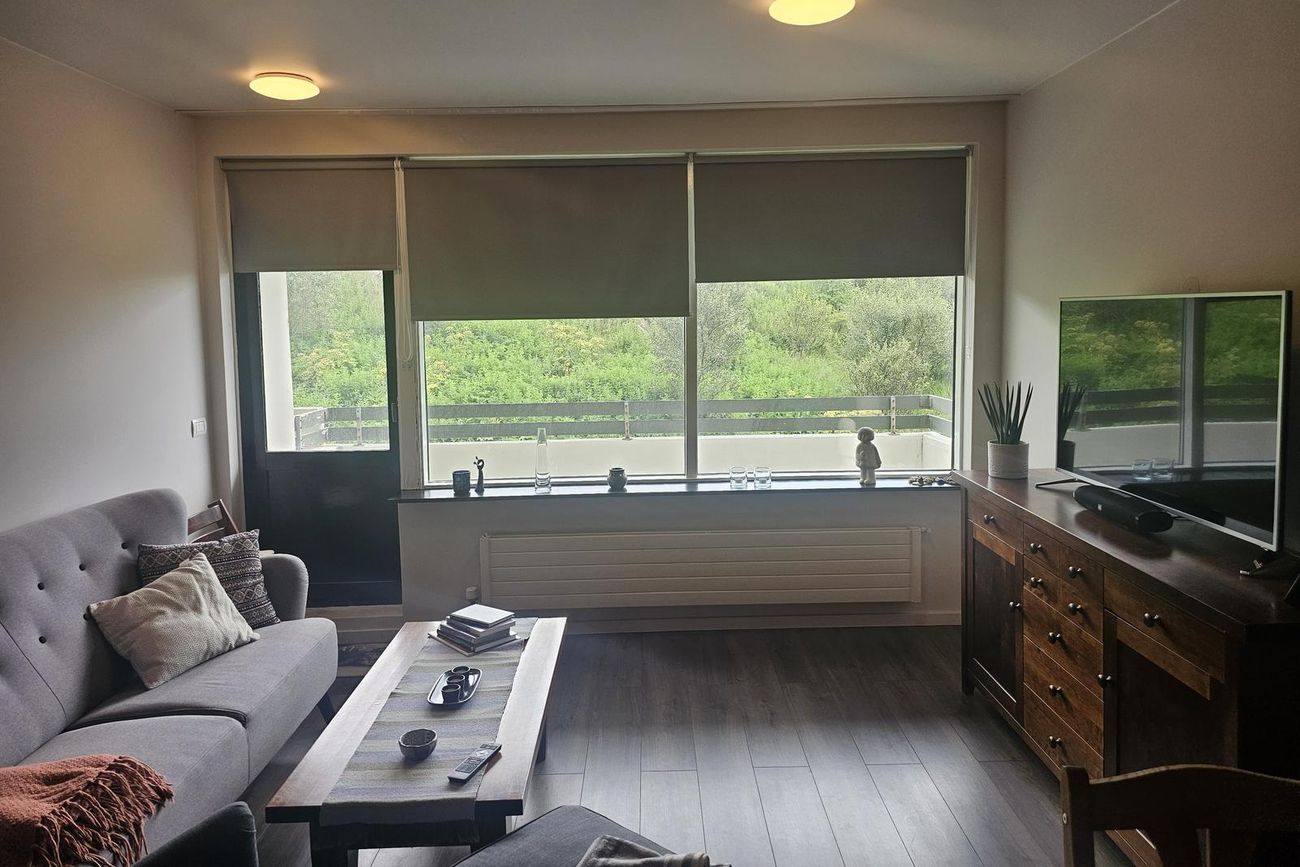 Stofa er björt og rúmgóð, og þaðan er gengið út á suðursvalir.