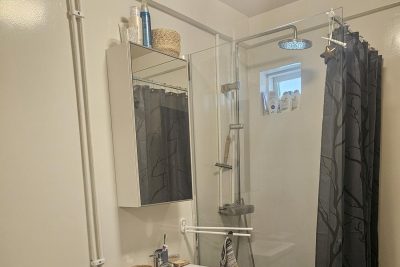 Baðherbergið er nýlega uppgert með flísum á gólfi og „walk in“ sturtu.