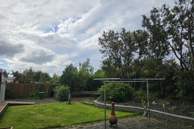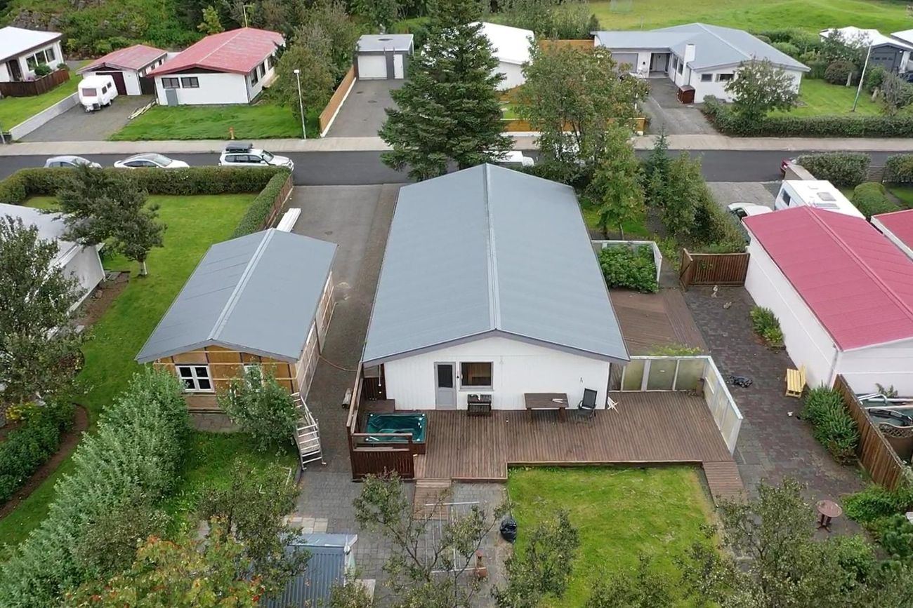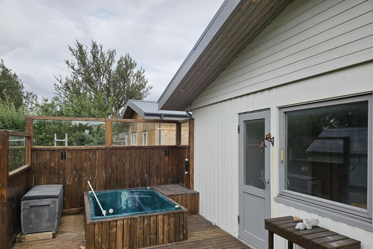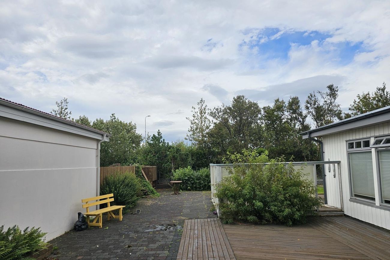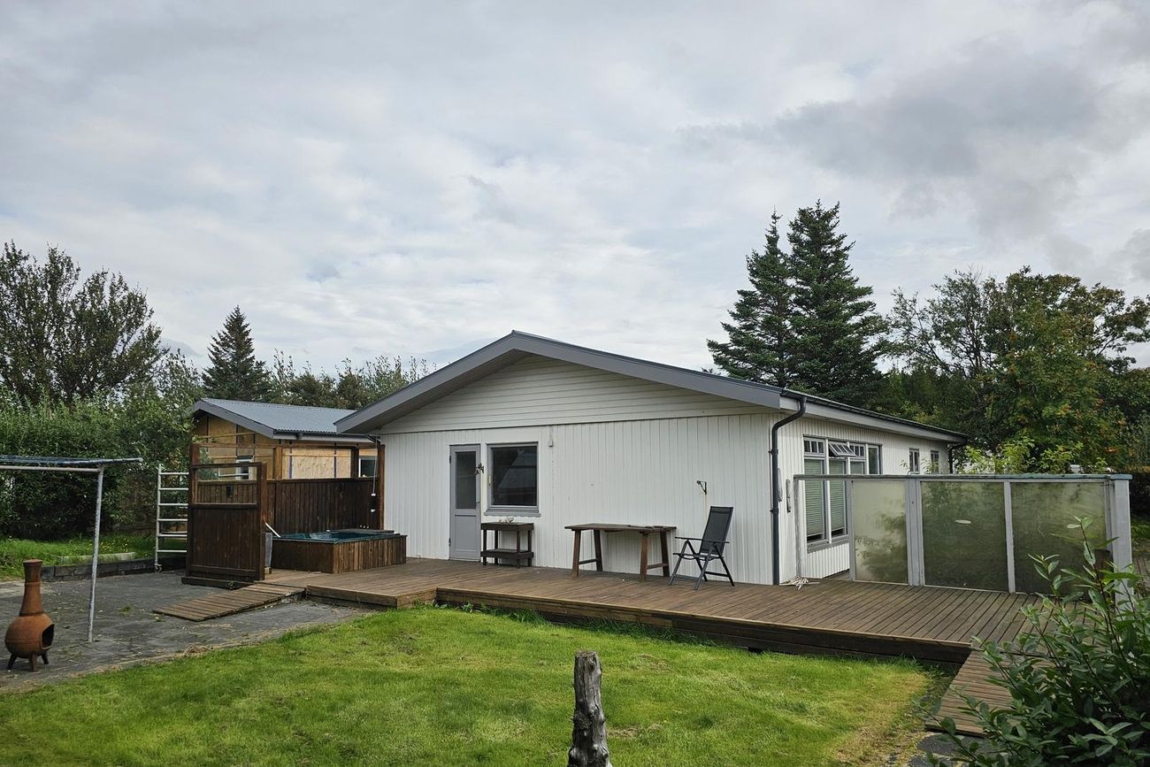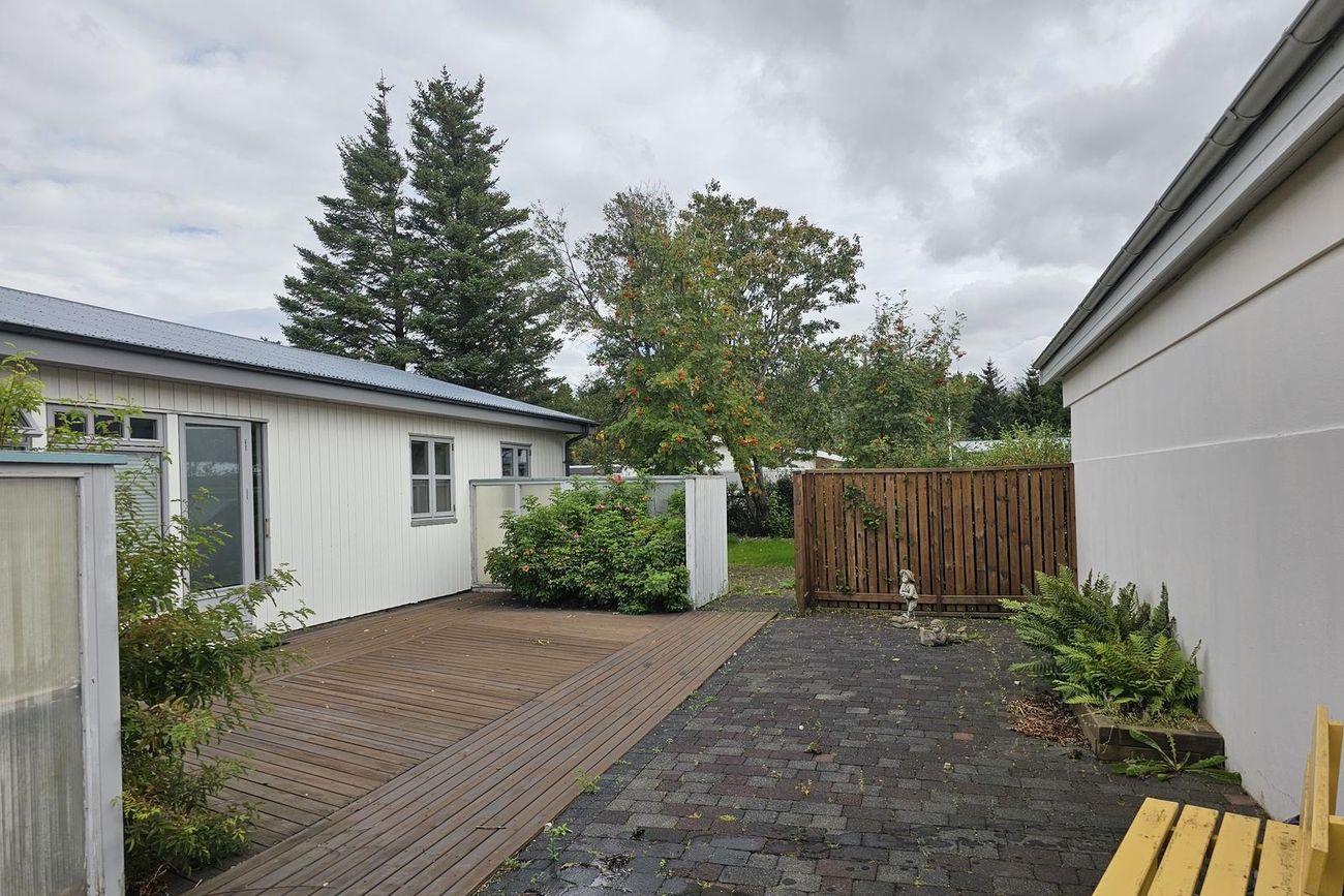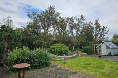 Lóðin er í góðri rækt með trágróðri og  grasflöt.  Þar er verönd með skjólveggjum, heitum potti ásamt  hellulögðum svæðum og vegg hlaðinn með kantsteinum sem afmarkar upphækkuð beð með skemmtilegum hætti. Þá er lítill áhaldaskúr á baklóðinni.