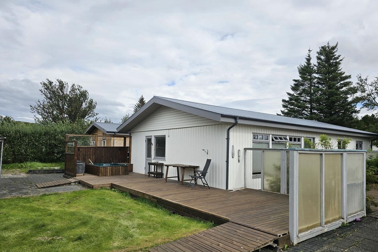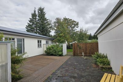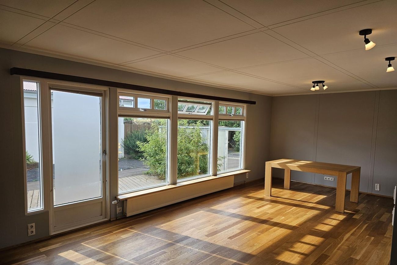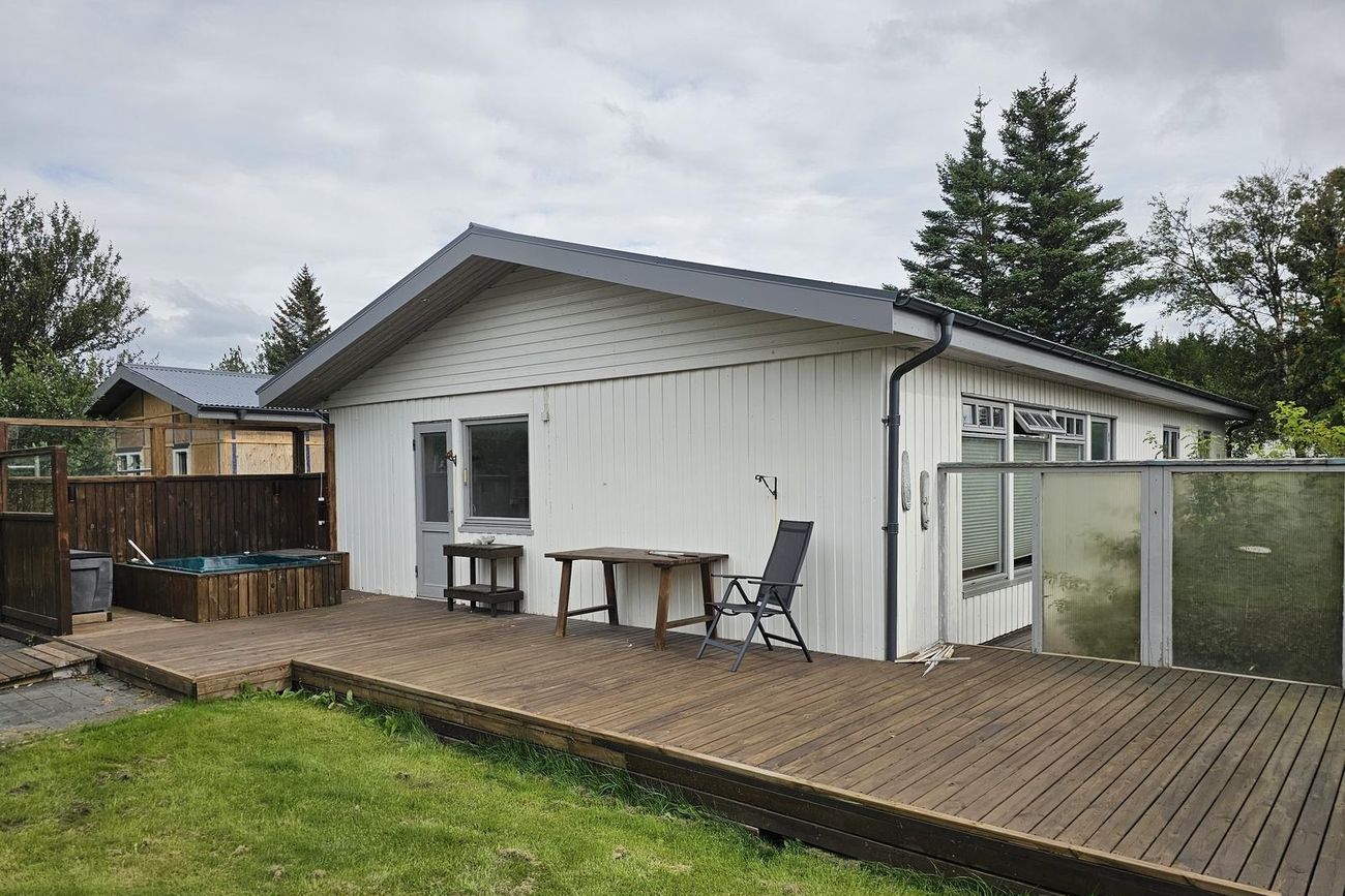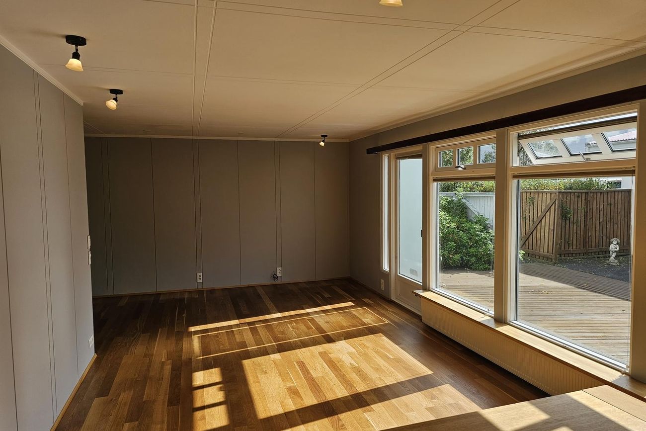 Stofa er rúmgóð og björt. Þaðan er gengið út á verönd sem er timbur og hellur að hluta.