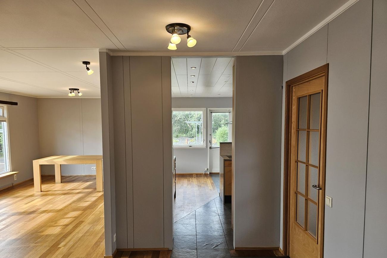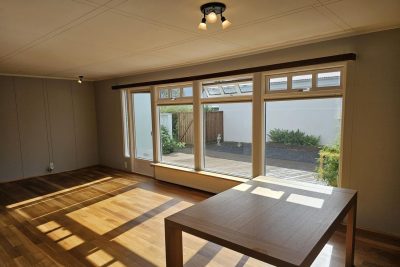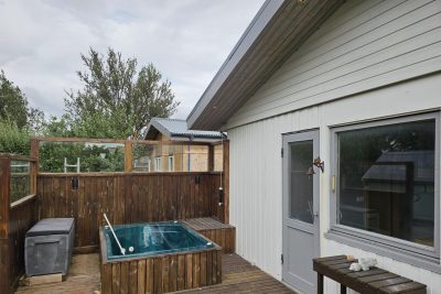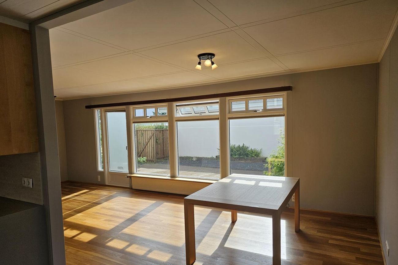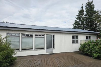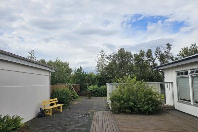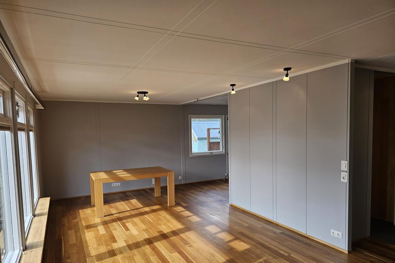 Stofa er rúmgóð og björt. Þaðan er gengið út á verönd sem er timbur og hellur að hluta.