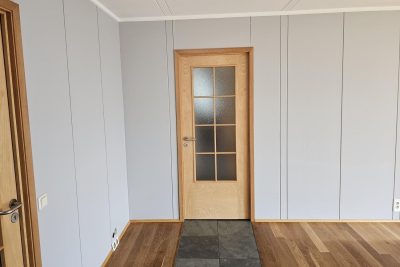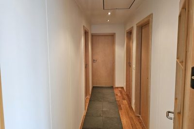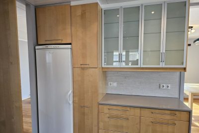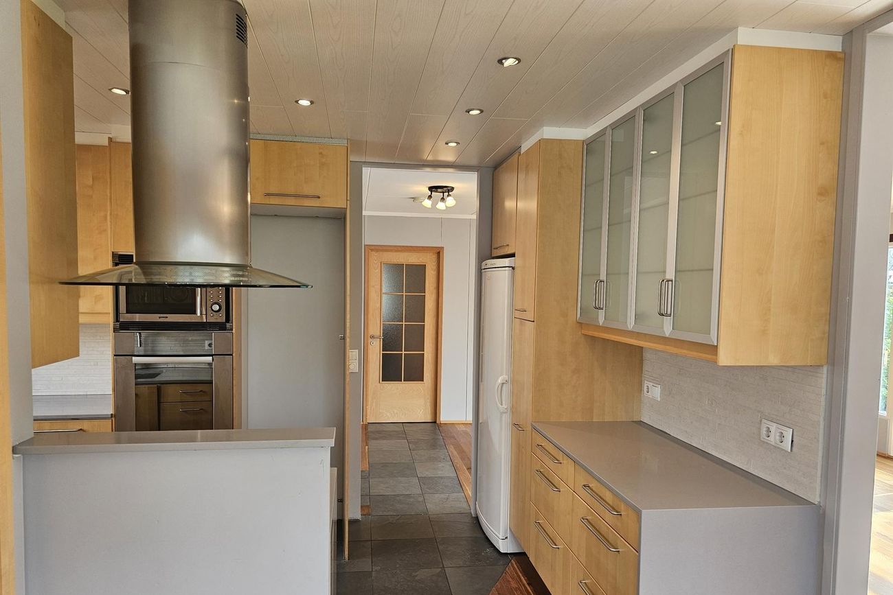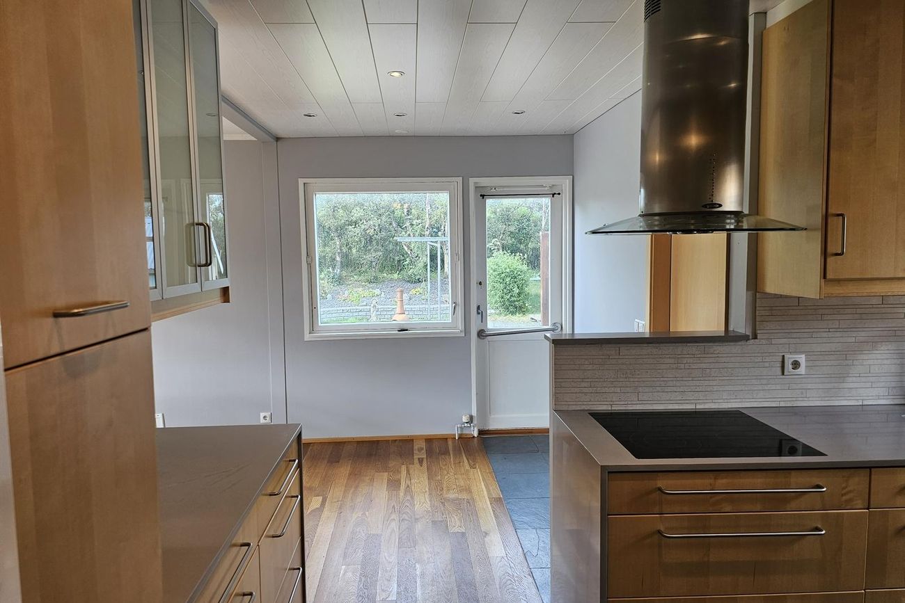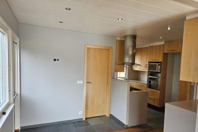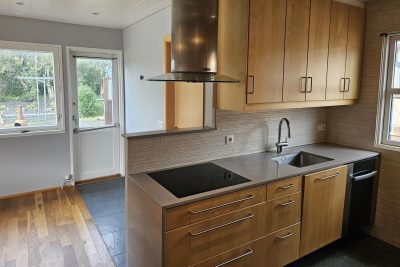Eldhús er flísalagt með hita í gólfi. Góð innrétting með helluborði, bakarofn í vinnuhæð og uppþvottavél.