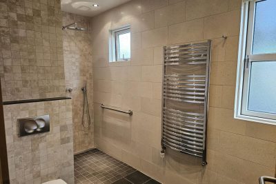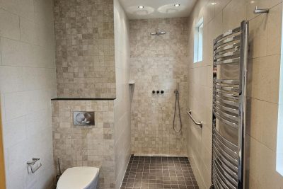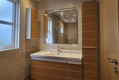 Baðherbergi er flísalagt í hólf og gólf.  Vegghengt salerni og góð innrétting. Gólfhiti og walk-in sturta
