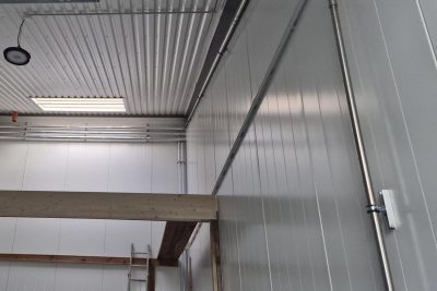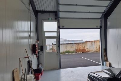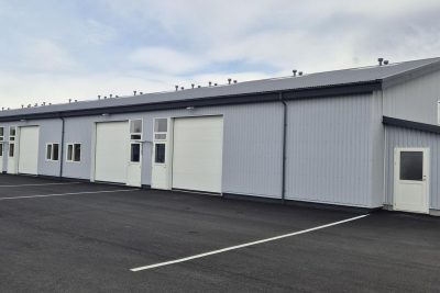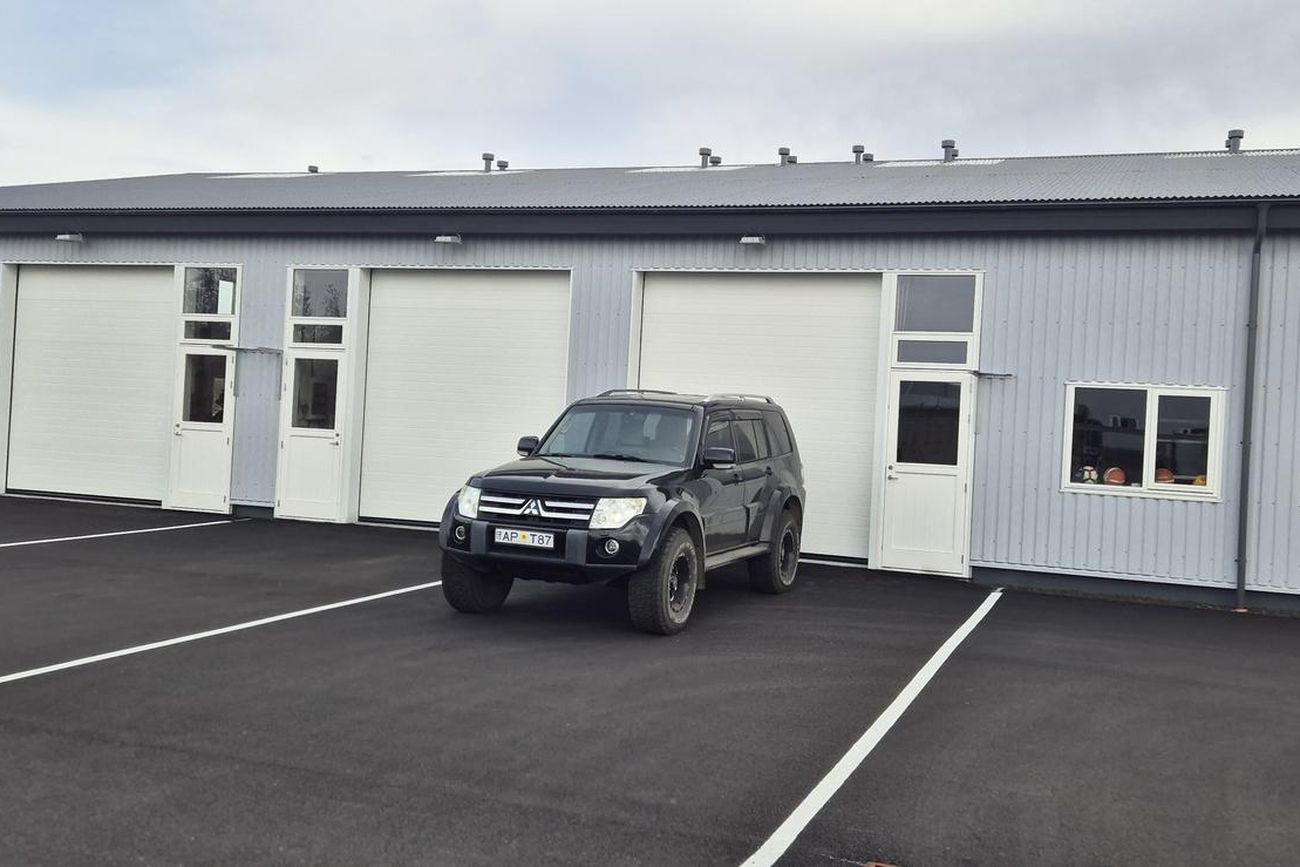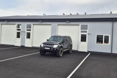 Stór rafdrifinn hurð með fjarstýringu og göngu hurð. Hiti í gólfi. Stútar fyrir klósett og ræstivask. Túða upp úr þaki til að tengja loftræstingu frá baðherbergi. Niðurföll fyrir innan og utan hurð. Rafmagnsmælir er fyrir hvert bil.