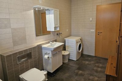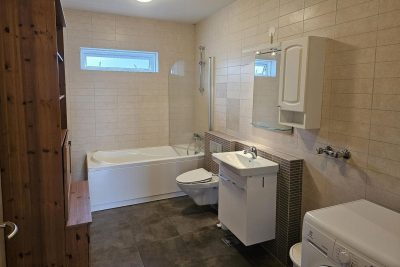 Baðherbergi: Flísalagt í hólf og gólf, upphengt salerni og baðkar með sturtu.
